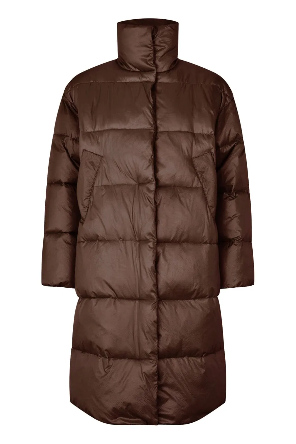 Lang pufferjakke fra MbyM i en dyb brun nuance kaldet Java. Jakken har et quiltet mønster skabt af vandrette syninger.