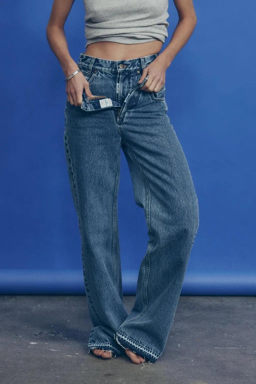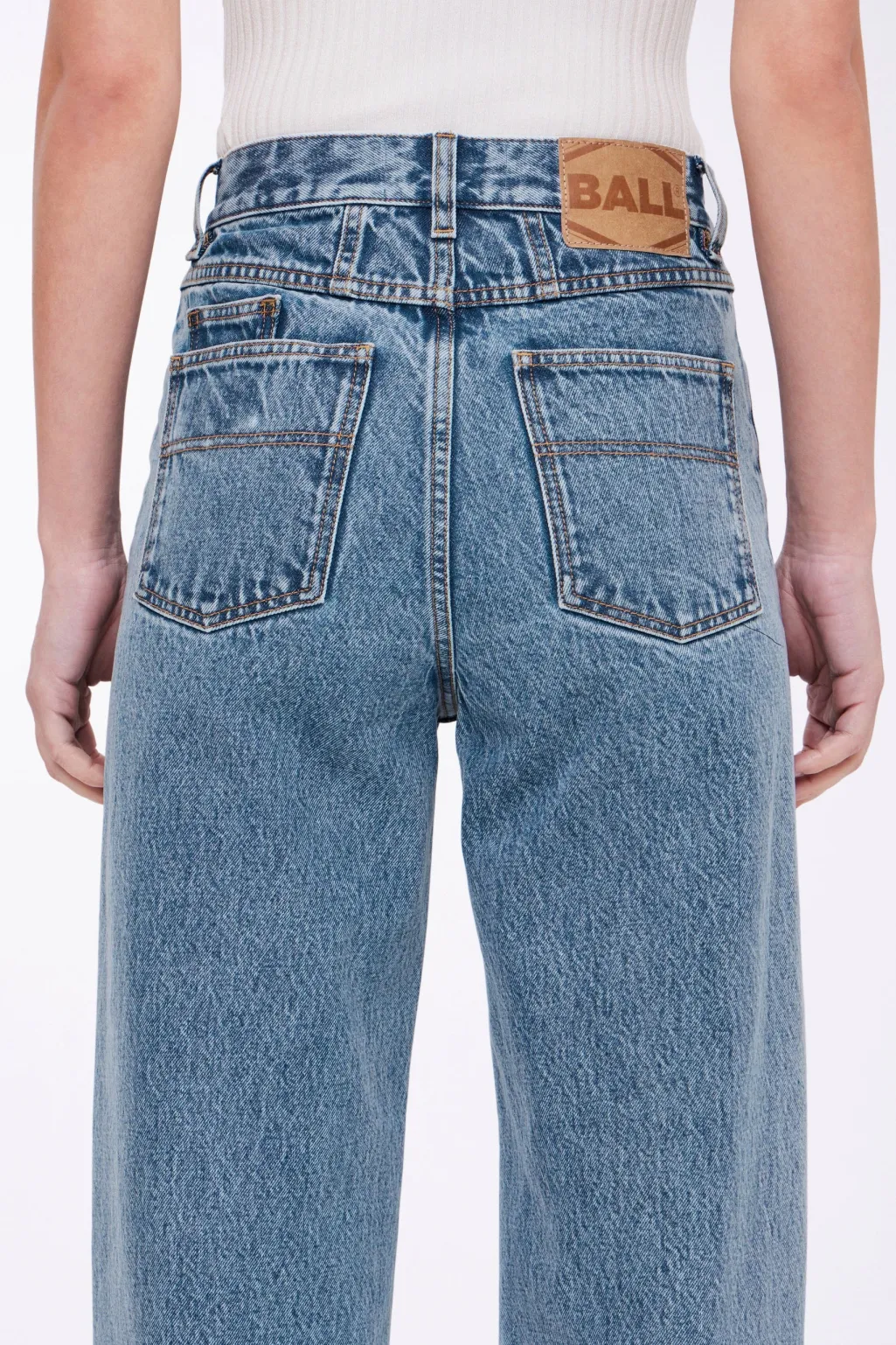 Jeans fra Ball i en marble wash blå farve. De har en bred benstil og gulvlængde. Jeansene kommer med et acid wash-mønster og dekorative syninger.