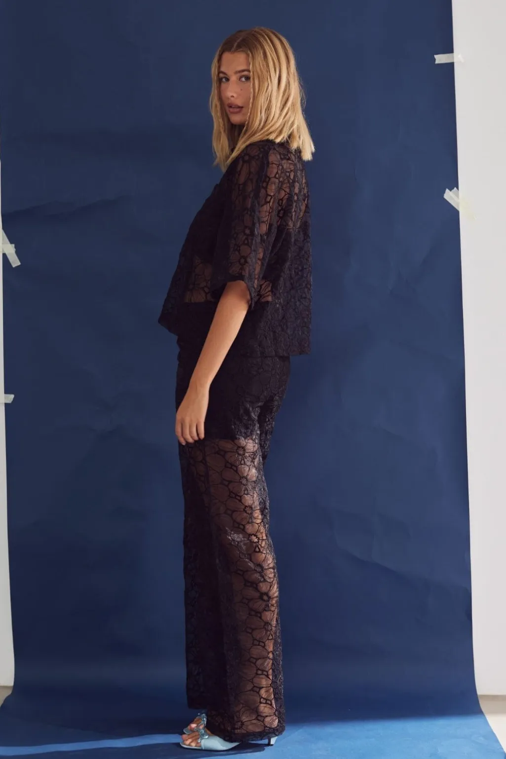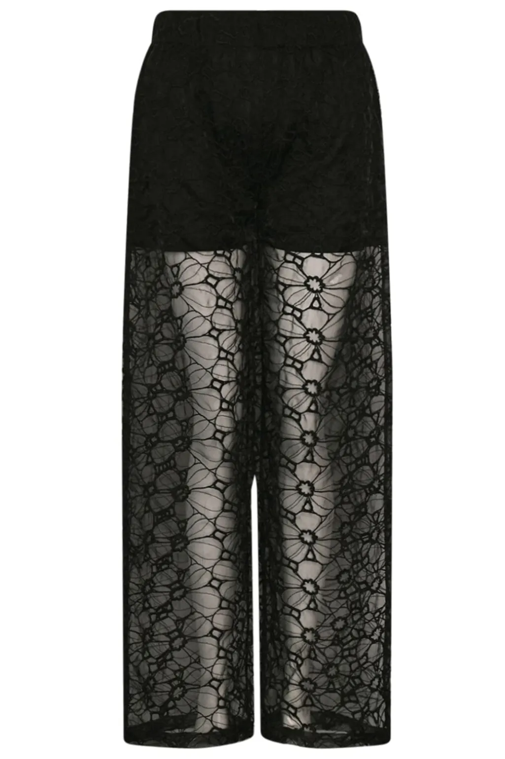 Sorte blondebukser fra Noella med gennemsigtig struktur og blomstermønster. Bukserne har en løs pasform og indershorts, designet til festlige anledninger.