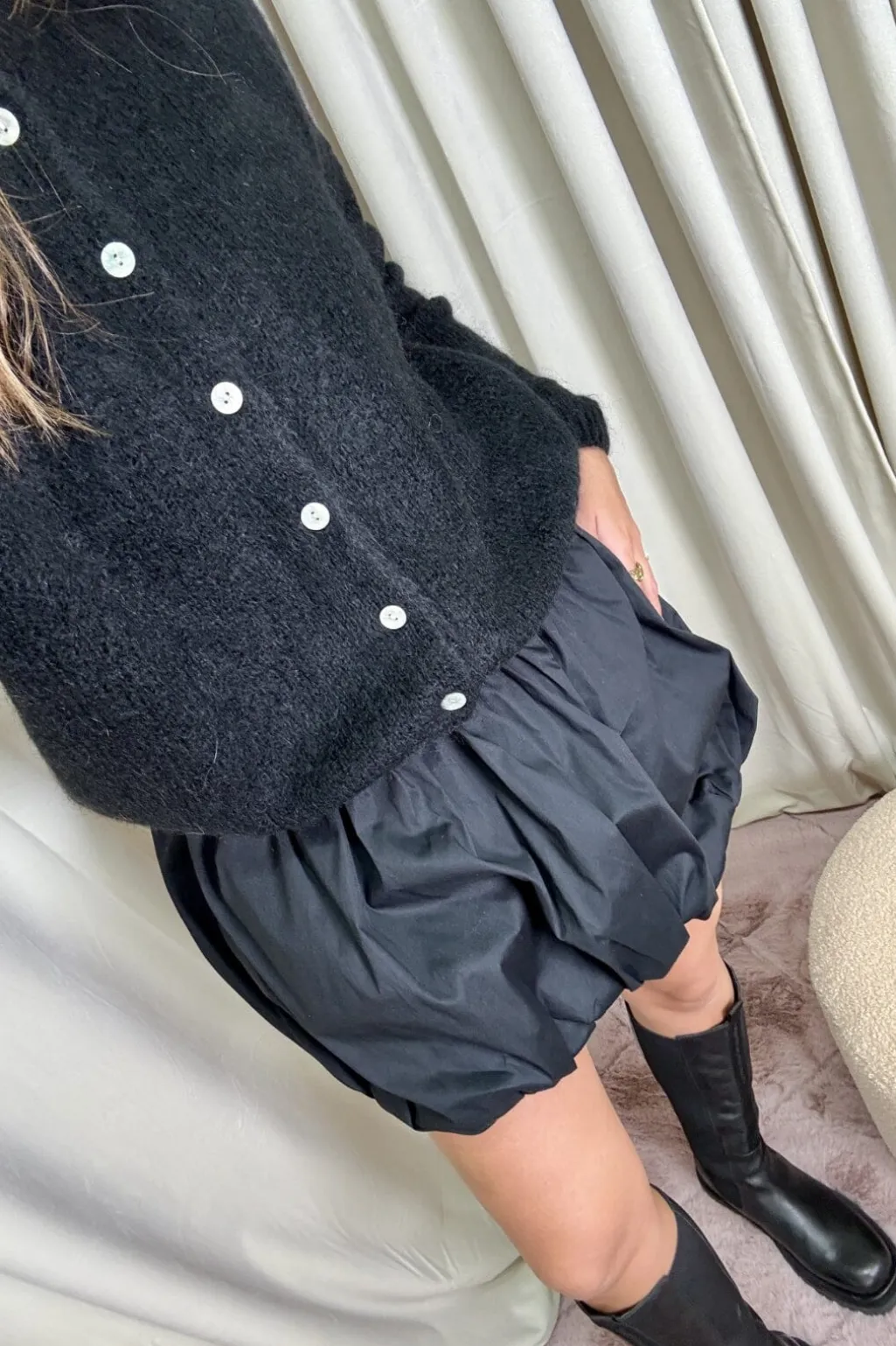 Sort ballonnederdel fra A-bee med rynket design. Nederdelen har en karakteristisk ballonform og sidder i normal taljehøjde med elastisk linning.