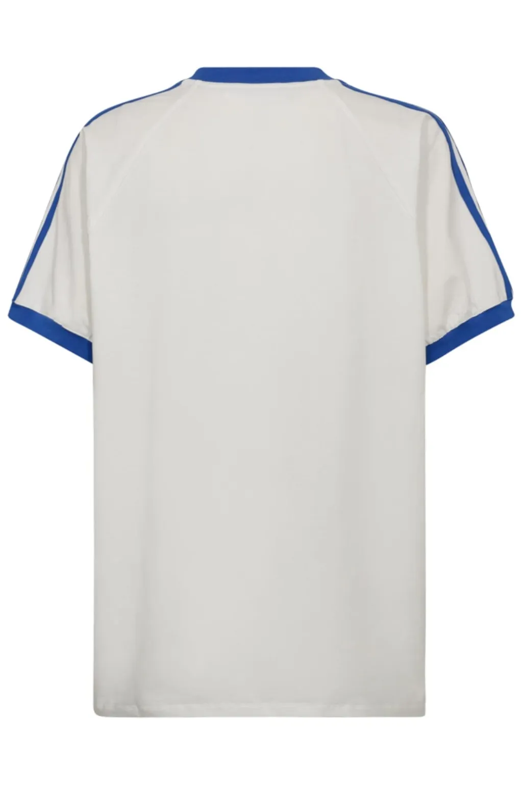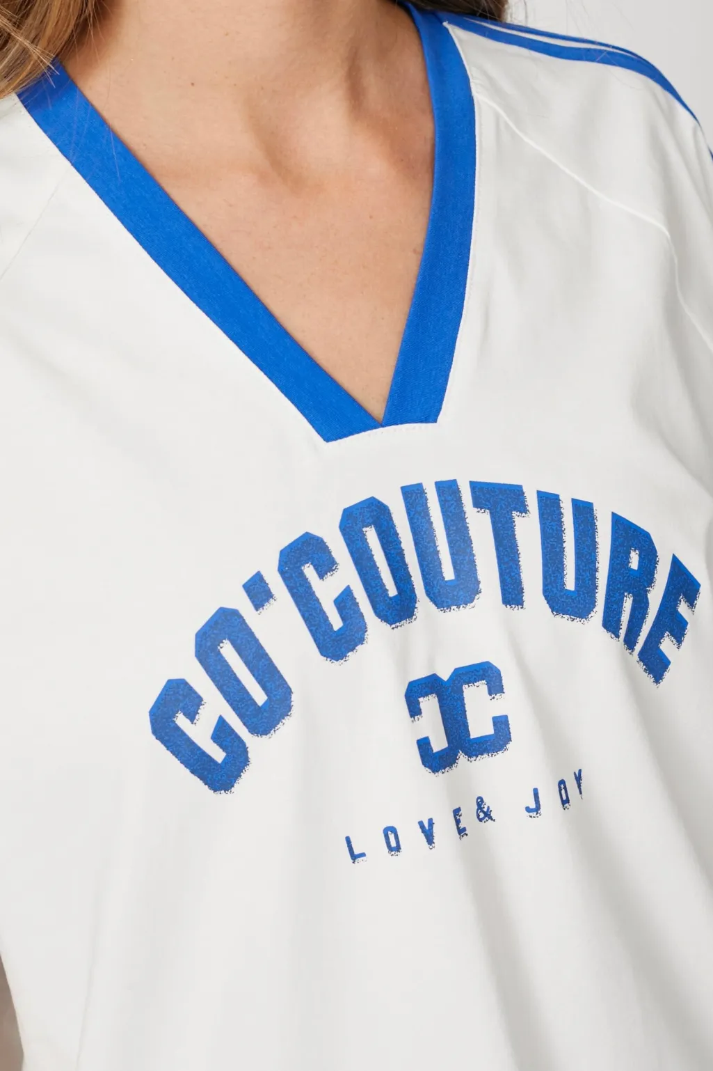 Oversized t-shirt fra Co’Couture i hvid med blå detaljer. T-shirten har en sporty v-hals og trykt tekst på forsiden.