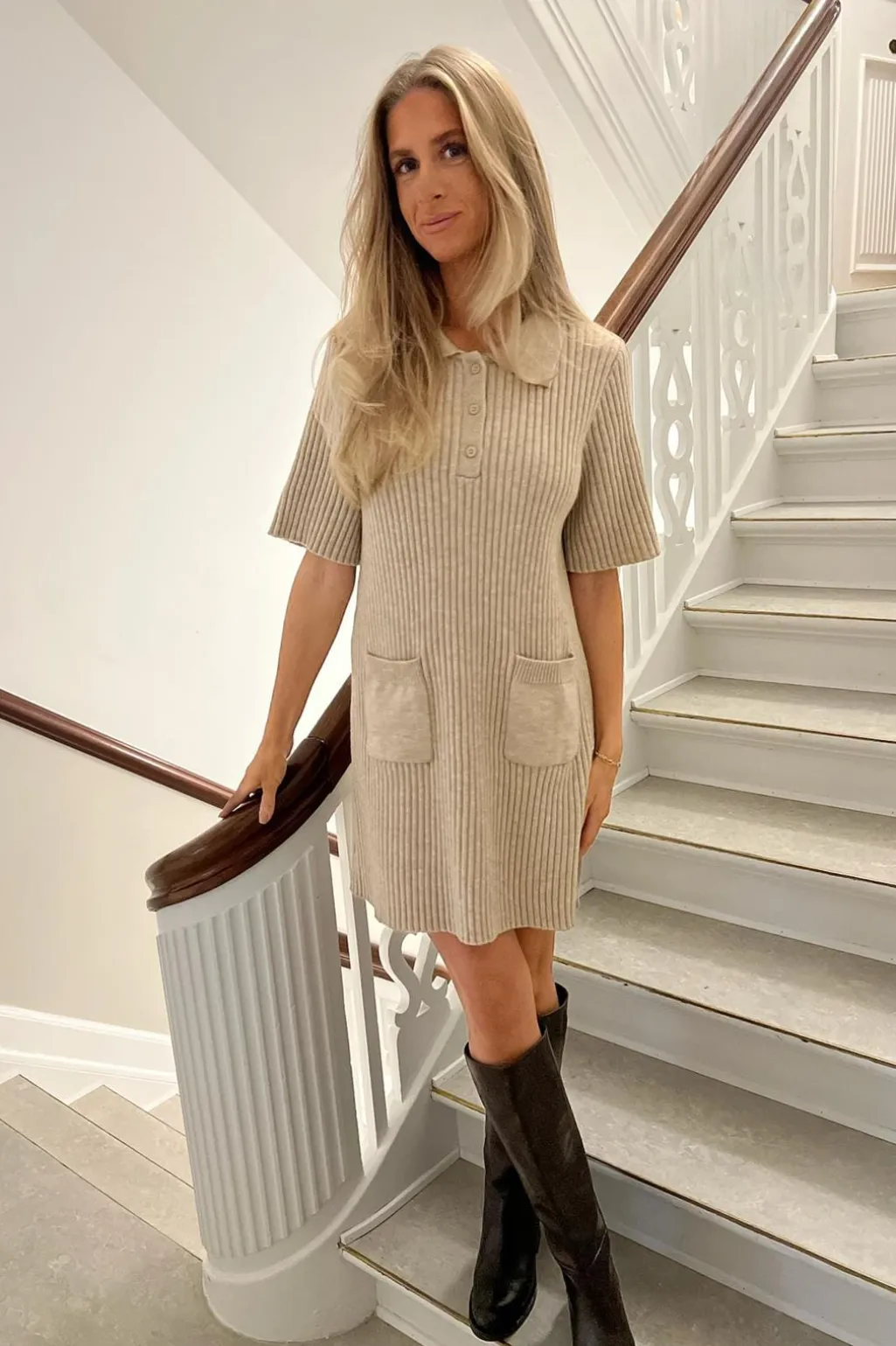 Beige strikket kjole fra BYIC med ribbet tekstur. Den har polokrave med knapper, korte ærmer og to forlommer med en anderledes struktur.