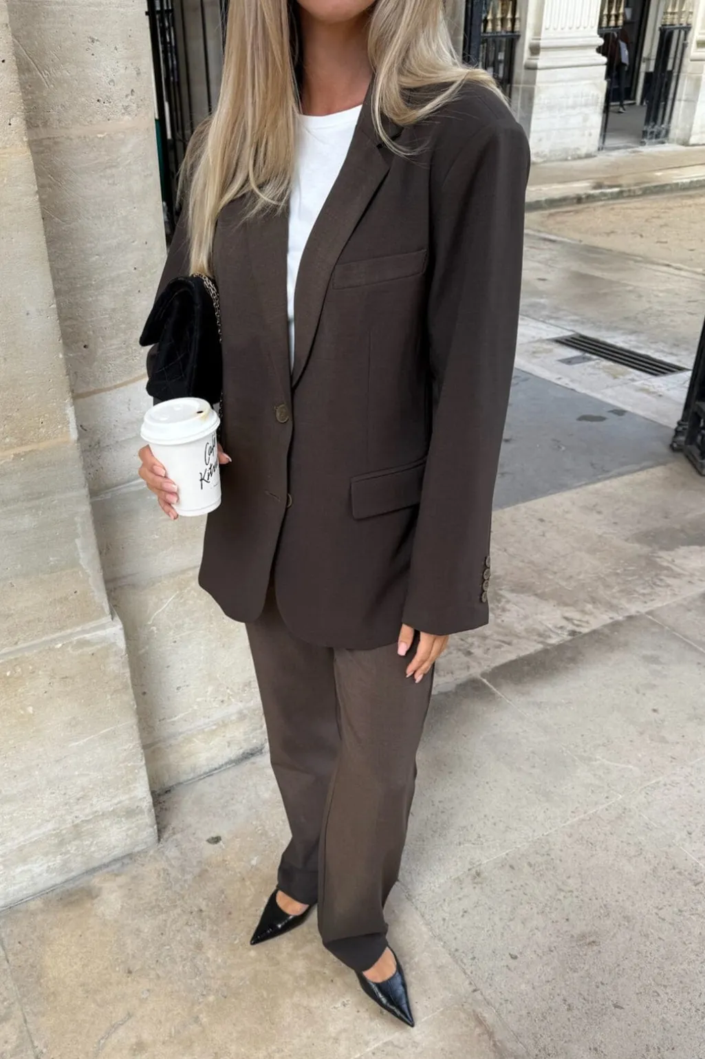 Mørkebrune bukser fra BYIC med lige snit og høj talje. Bukserne har bæltestropper i taljen samt knap- og lynlåslukning foran.