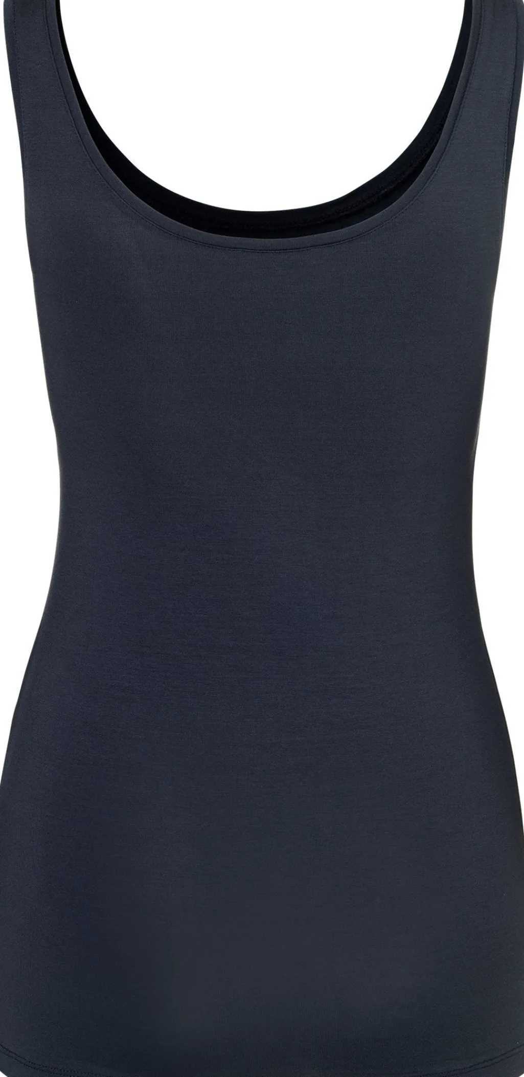 Mørkeblå top fra MbyM i et blødt og strækbart stof. Toppen har brede stropper og en rund halsudskæring, der gør den nem at style til forskellige anledninger.