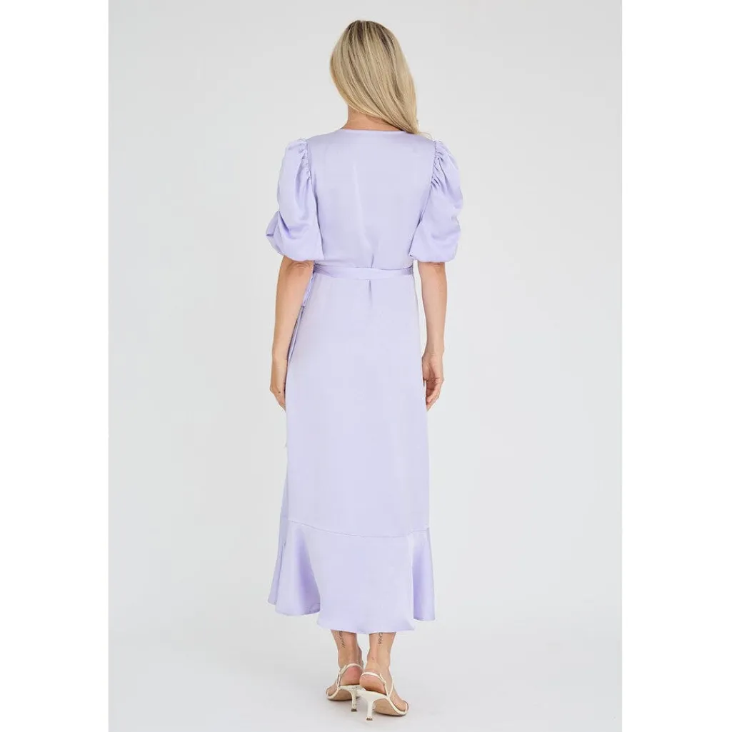 Lilla kjole fra A-View med slå-om-design og puffede ærmer. Kjolen har en asymmetrisk flæsekant og en V-udskæring.