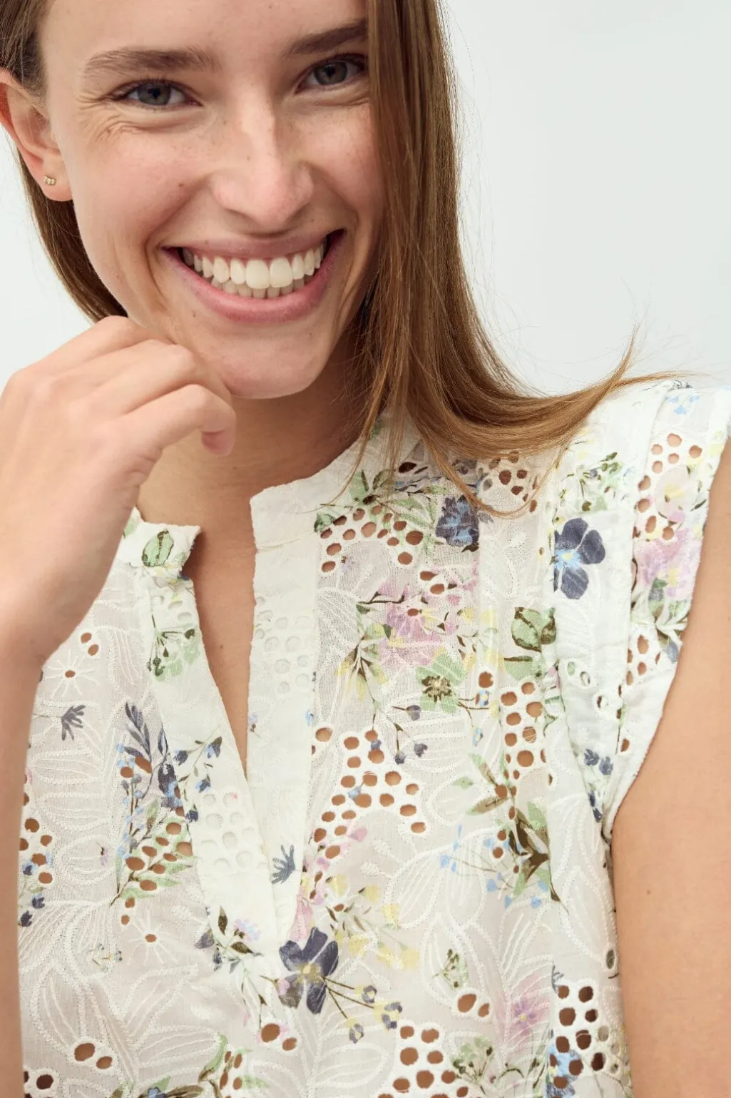 Ærmeløs top fra MbyM med peplumkant og flæsedetaljer. Det blomstrede mønster i pink og blå på hvid baggrund giver toppen et friskt udtryk. V-halsudskæringen og de bløde flæser skaber et feminint design.