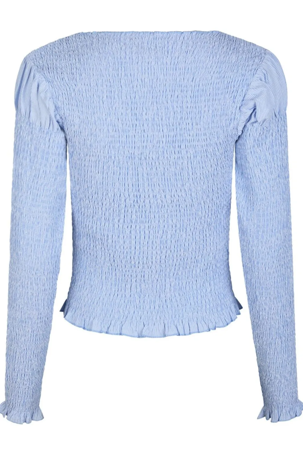 Lyseblå bluse fra Neo Noir med smocksyning. Blusen har lange ærmer og rund hals med knaplukning foran. Smocksyede detaljer og flæsekanter giver blusen et blødt udtryk.