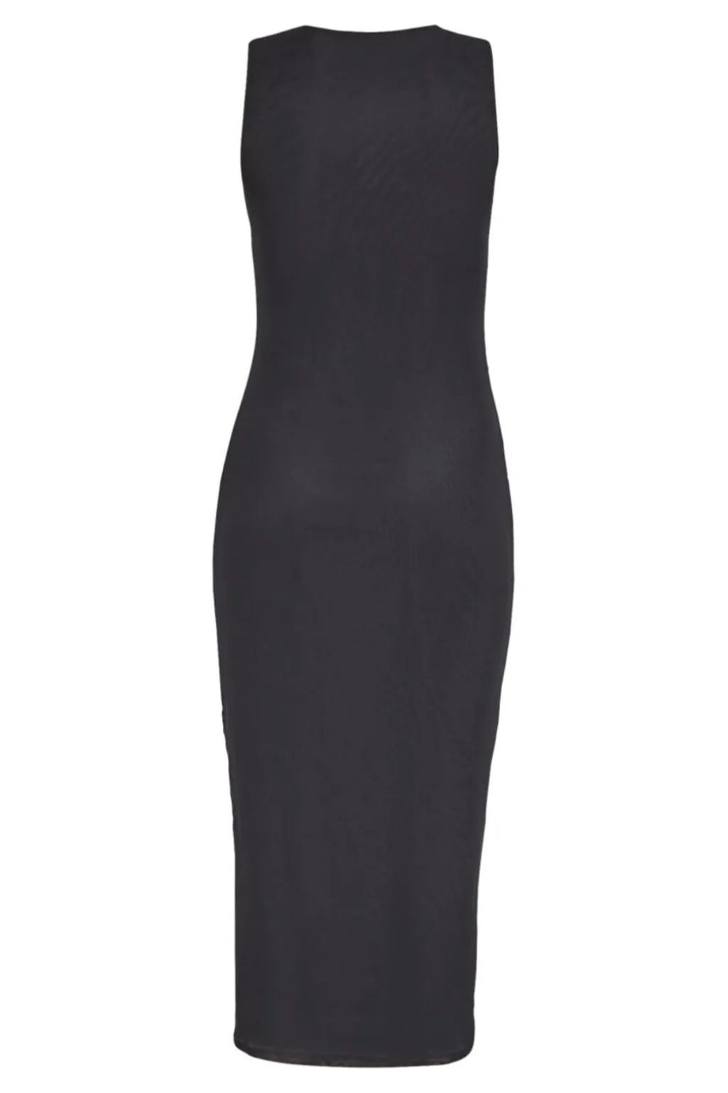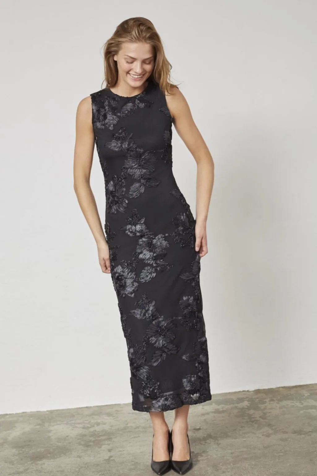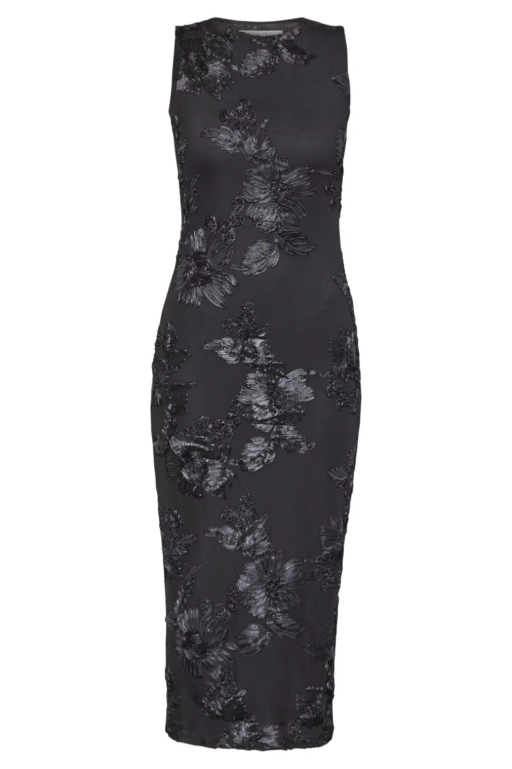 Sort kjole fra Sisters Point med broderede blomstermotiver. Kjolen er figursyet, ærmeløs og har en ankellang pasform med rund halsudskæring.