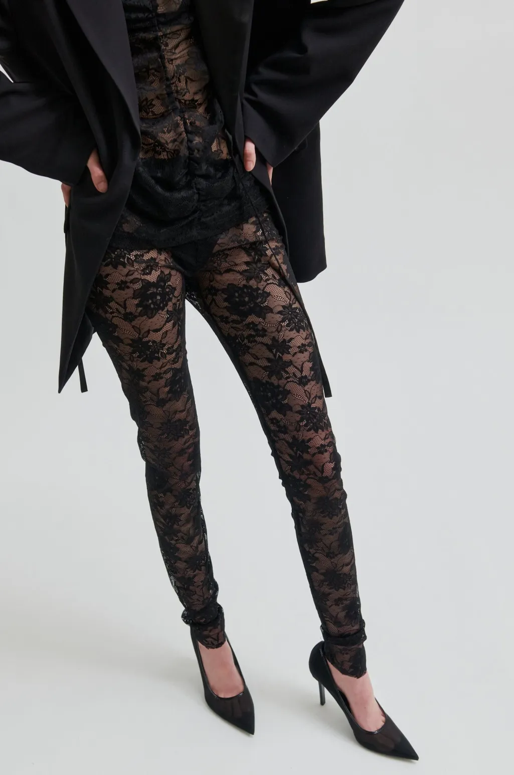 Sorte leggings fra Second Female med et gennemgående blomstret blondemønster. Lavet af transparent og strækbart blondestof i en klassisk sort farve.
