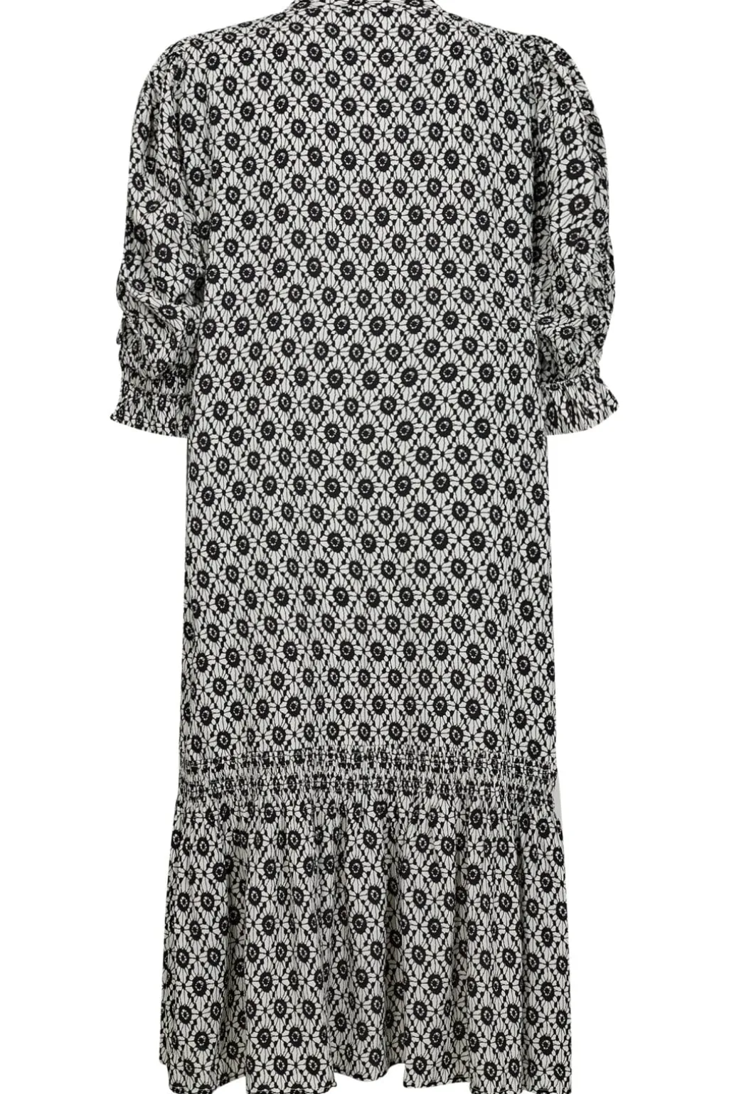 Blomstret kjole fra Co´Couture i offwhite og sort. Den har V-udskæring, korte pufærmer og smock-detaljer ved taljen. Kjolen går til midt på læggen.