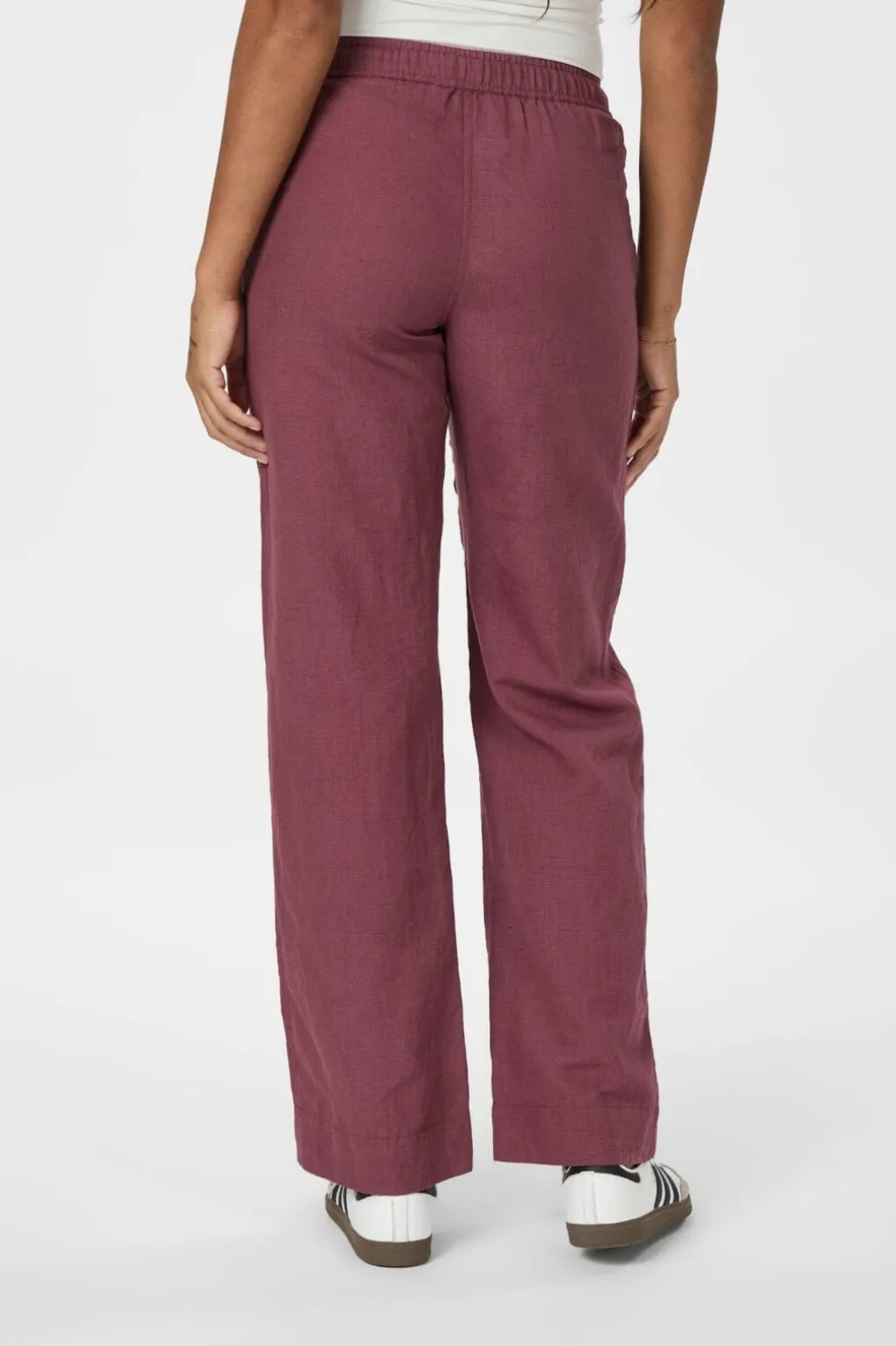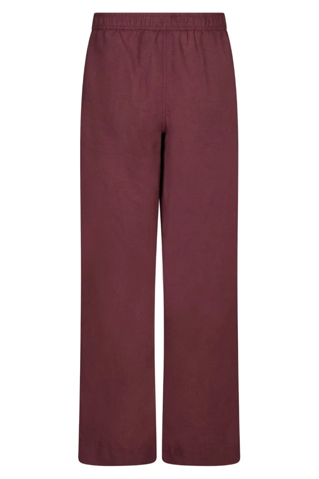 Mørkrosa bukser fra Neo Noir i en blanding af bomuld og hør. Bukserne har brede ben og en elastisk talje med bindebånd.