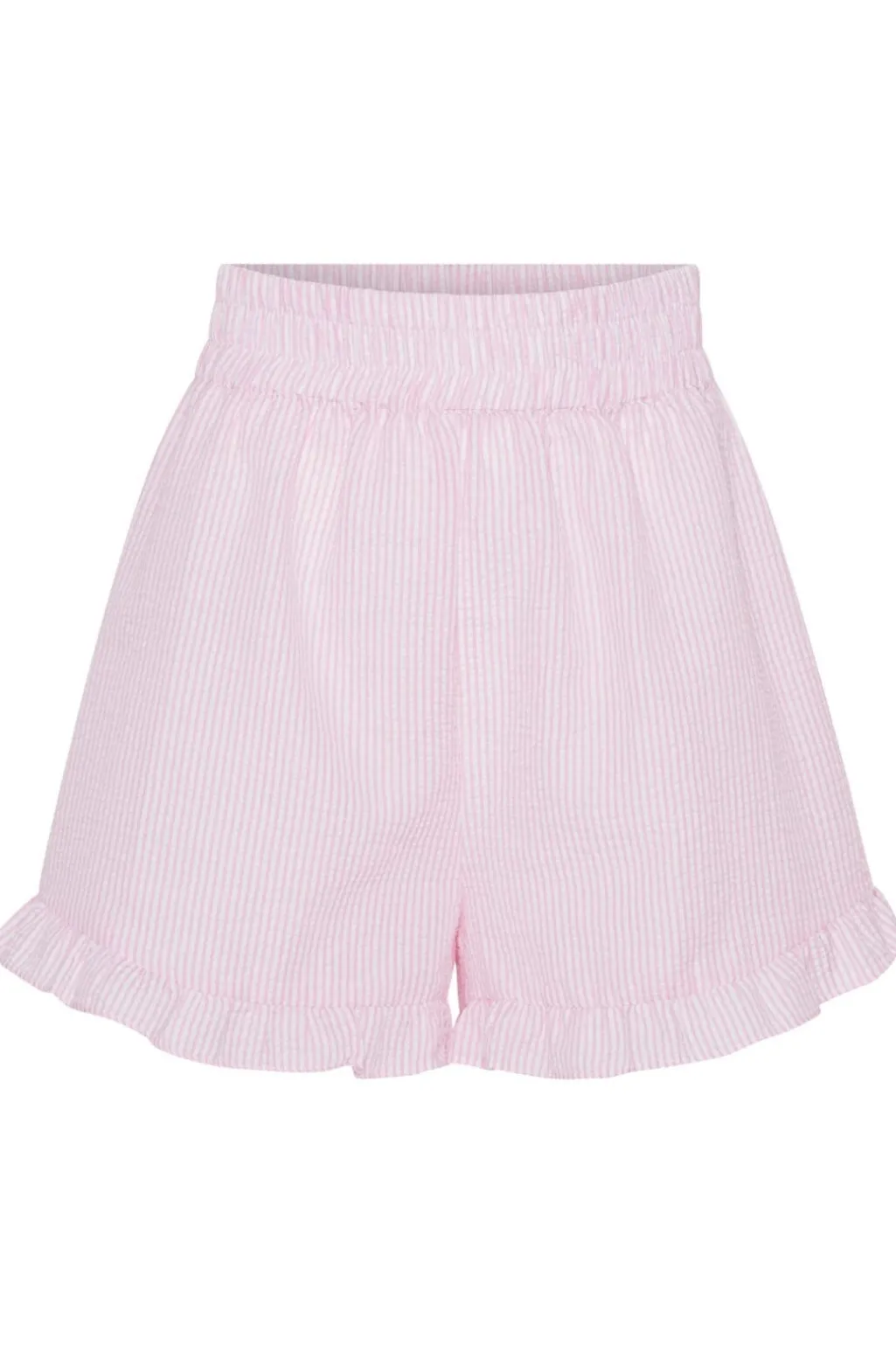 Pink- og hvidstribede shorts i crepe-materiale med flæsekant forneden. Den høje talje med elastik giver en behagelig pasform, mens den løse model sikrer god bevægelsesfrihed.