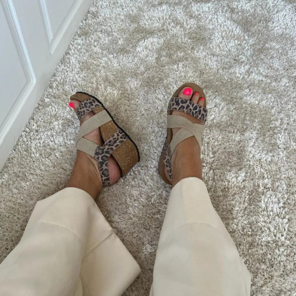 Sandal fra Copenhagen Shoes i italiensk læder med leopardmønster og sorte elastiske bånd. Sandalen har en kilehæl og en behagelig latexsål.