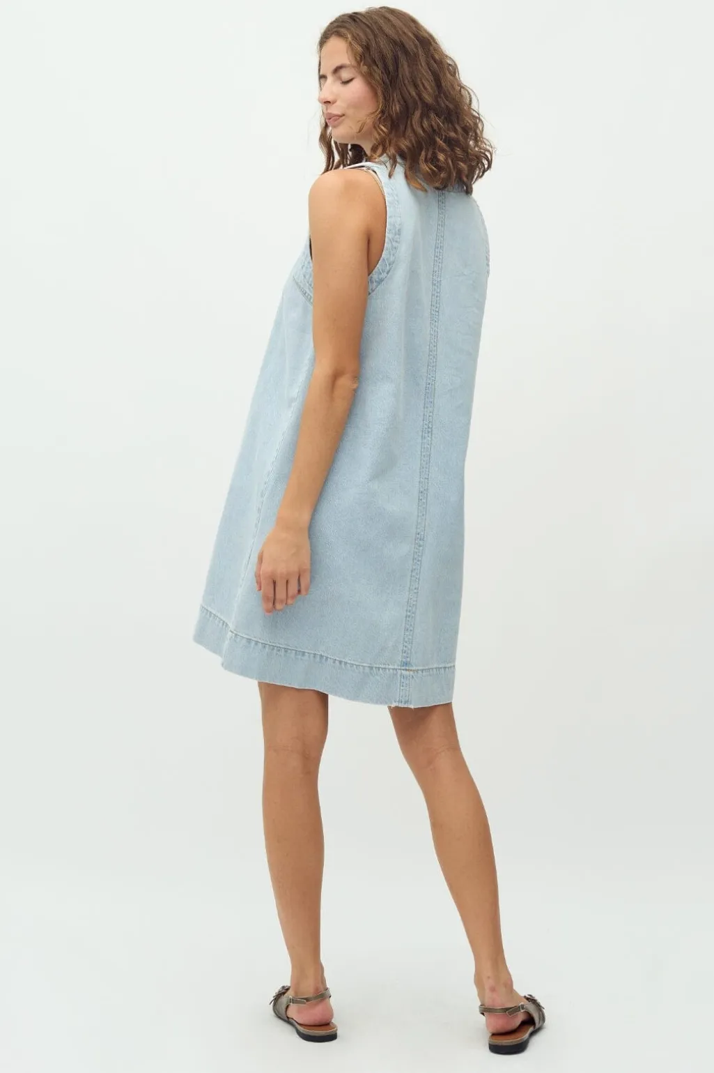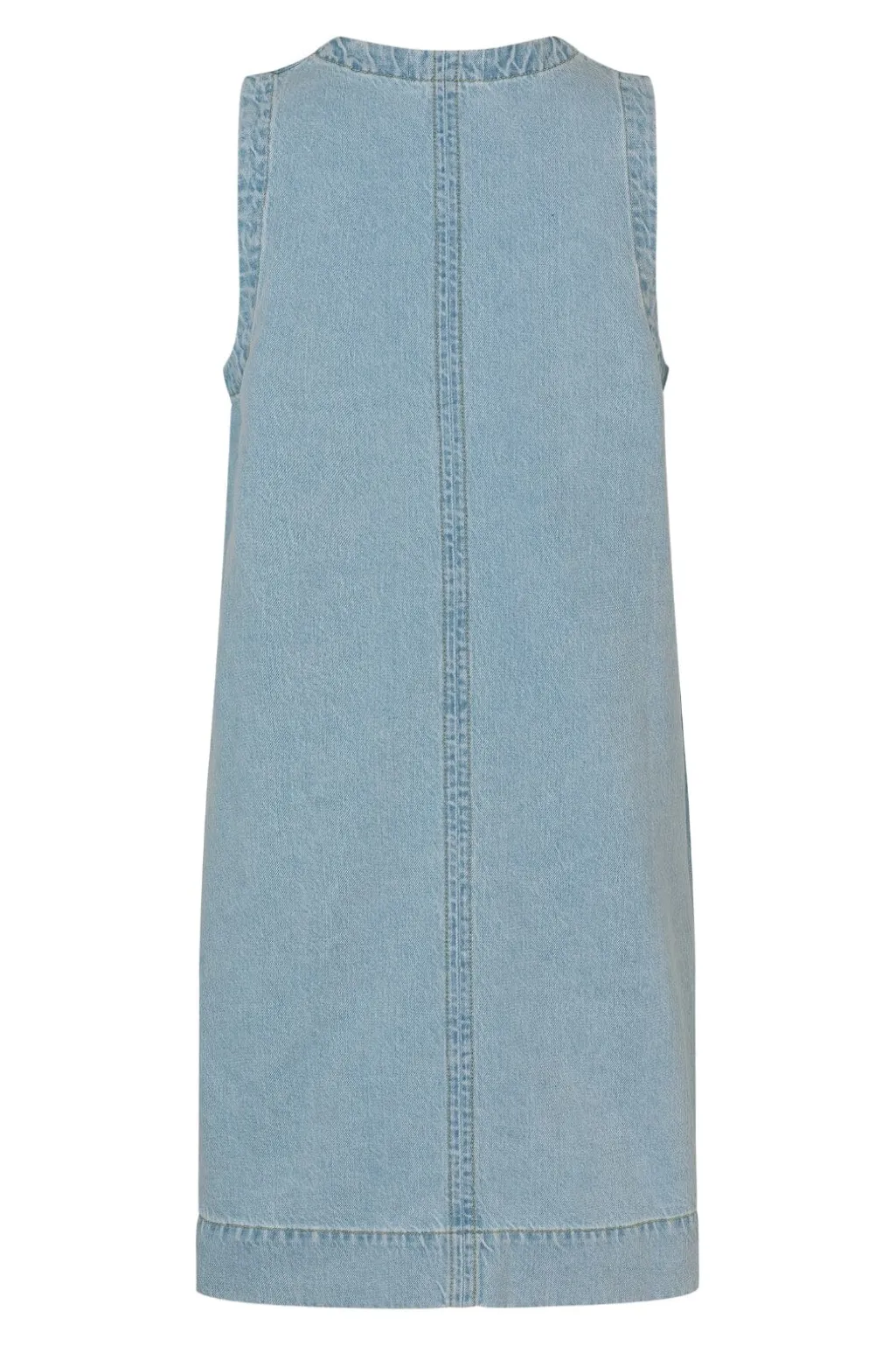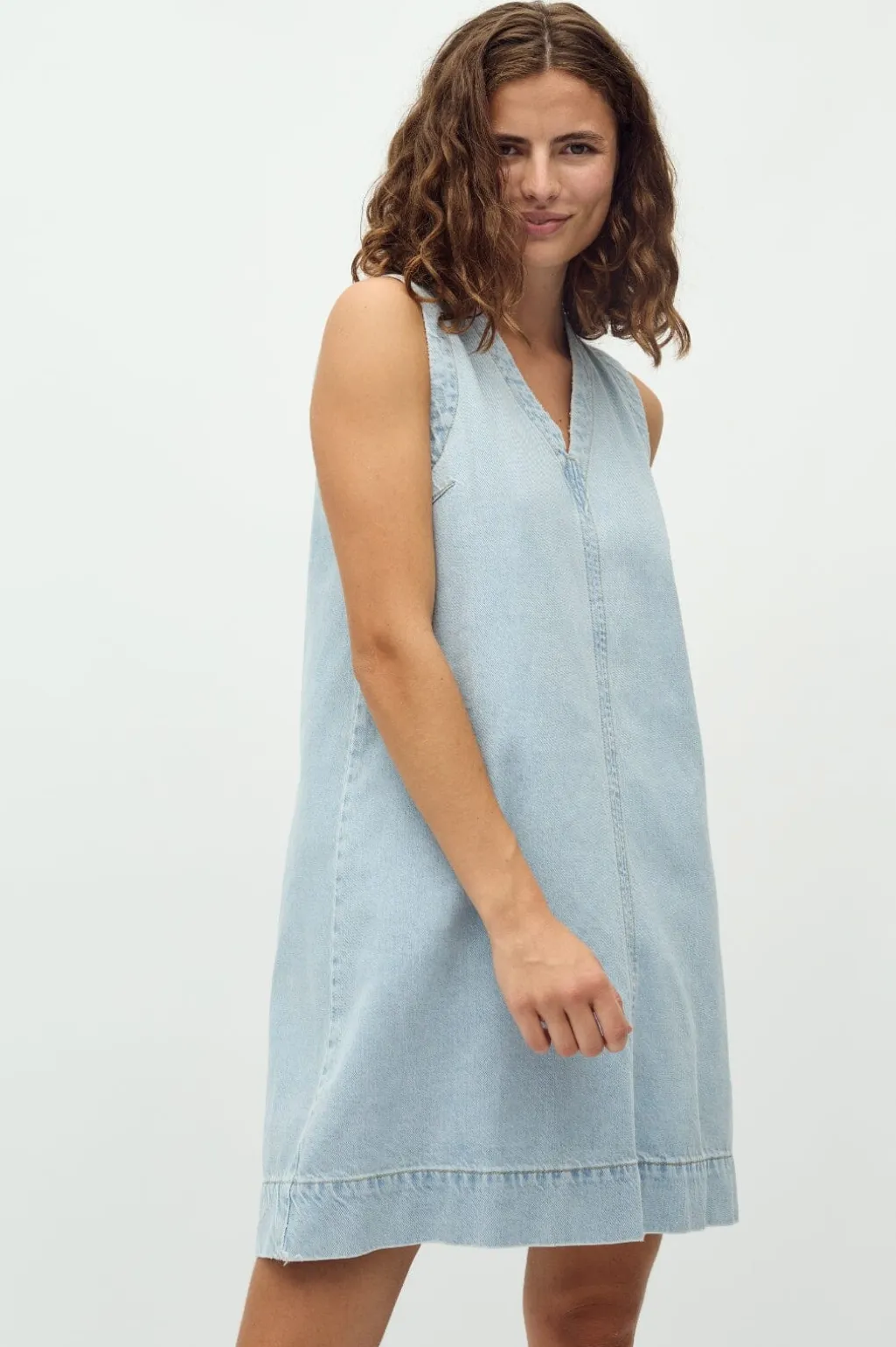 Ærmeløs denimkjole fra MbyM i en lys blå vask. Kjolen har en V-udskæring og en lige pasform, der falder til låret. Den lyseblå vask giver et friskt præg.