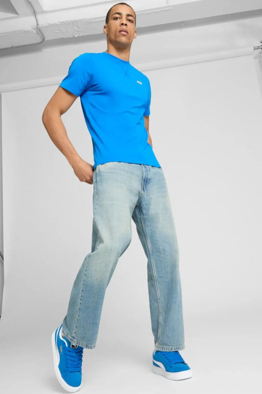 Blå sneakers fra Puma med overdel i ruskind og hvide detaljer. Skoene har den klassiske Suede-model med guldfarvet logo på siden og på tungen.