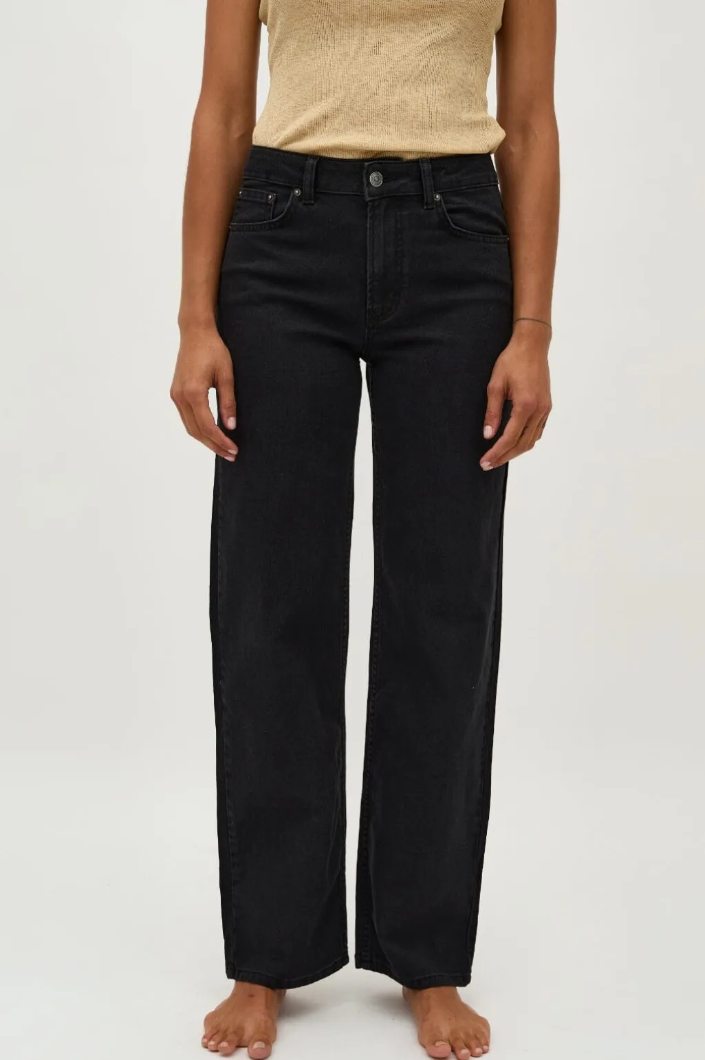 Sorte jeans fra Global Funk med høj talje og bred benåbning. Bukserne har en afslappet pasform og er lavet i en blød bomuldsblanding med stræk.