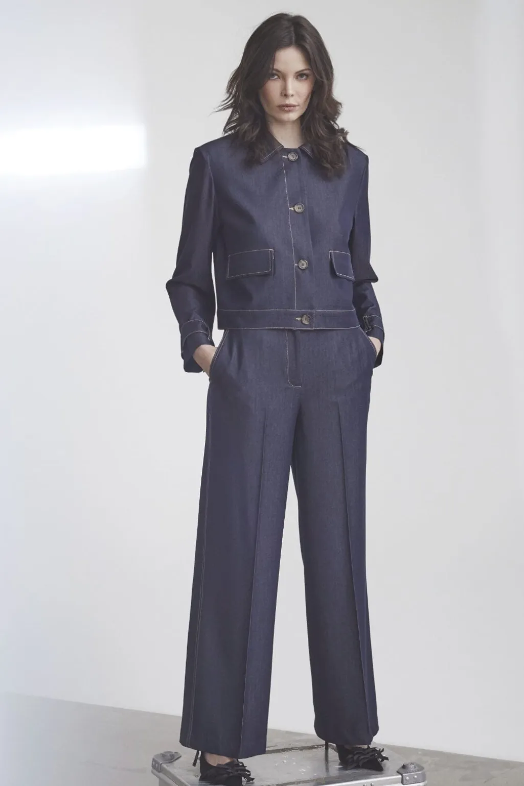Mørk denimjakke fra Co’Couture med cropped design. Jakken har skjortekrave og knaplukning foran. De kontrasterende syninger giver jakken sit karakteristiske denimlook.