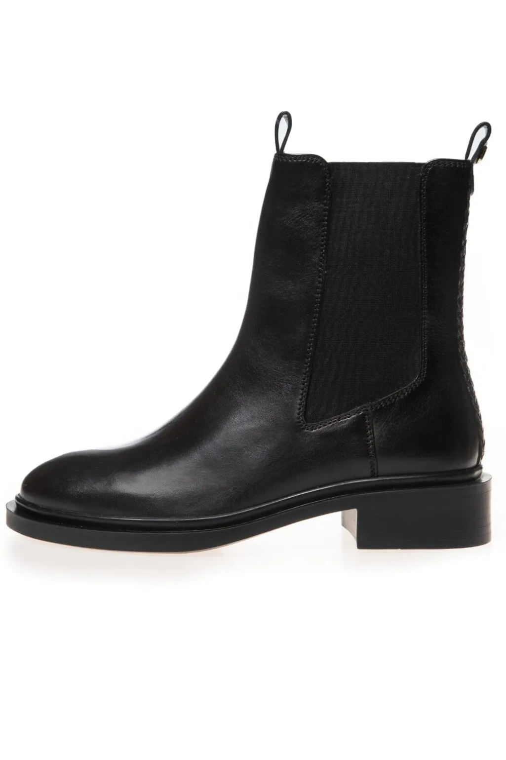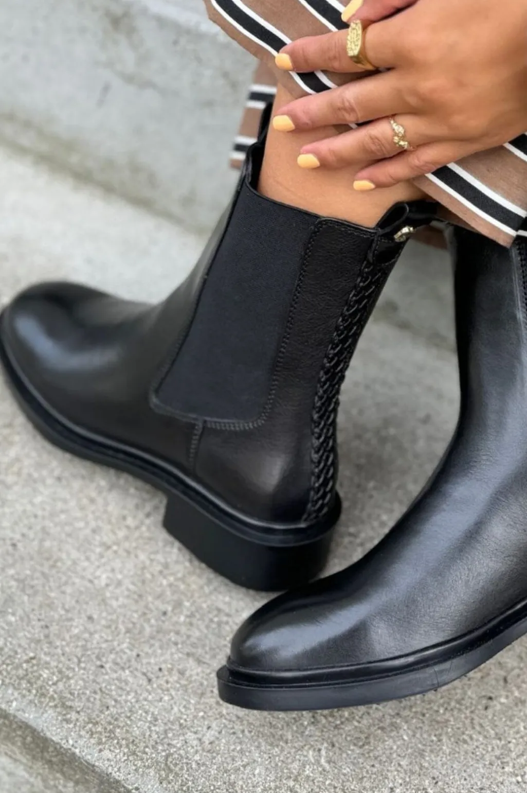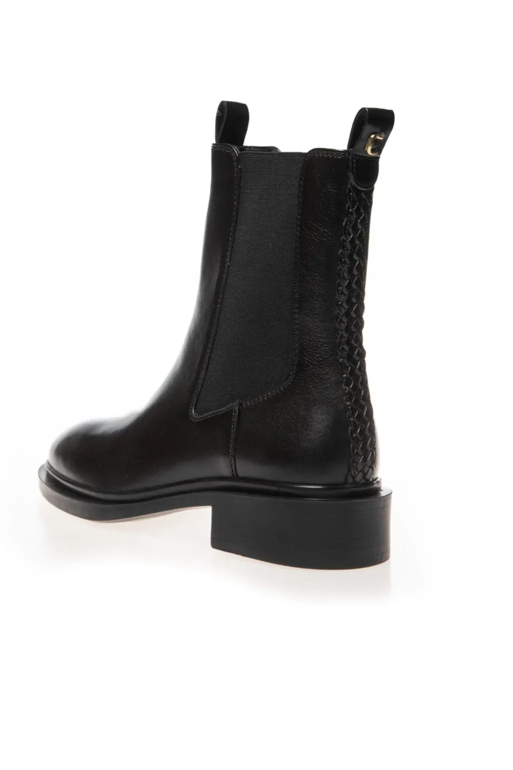 Sorte ankelstøvler fra Copenhagen Shoes i læder med flettet detalje på siden. Støvlerne har en rund tå og en stabil blokhæl, der er lavere end 5 cm.