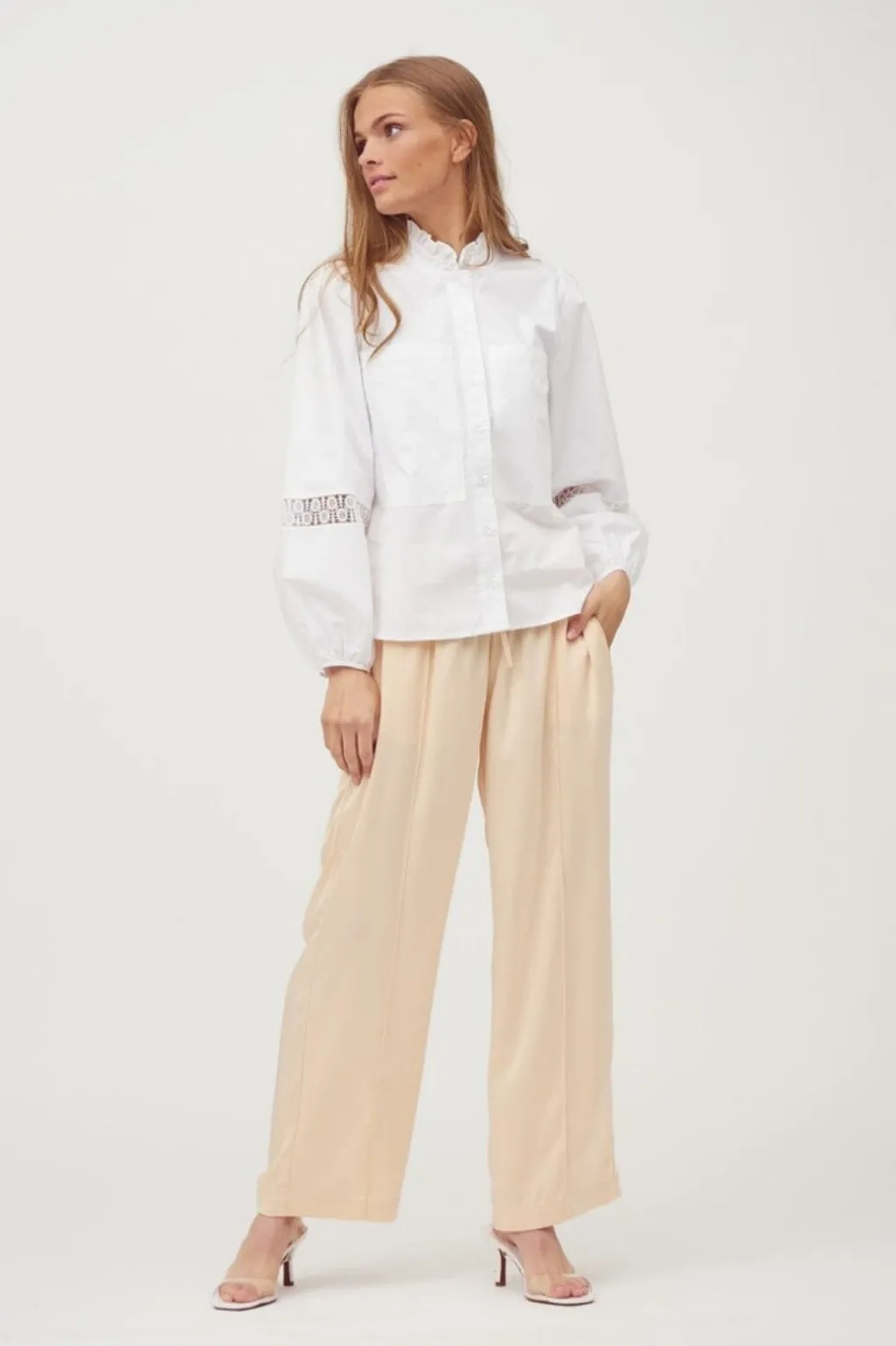 Hvid skjorte fra A-View med rynket høj krave og pufærmer. Skjorten har blondedetaljer ved både kraven og manchetterne samt to frontlommer.