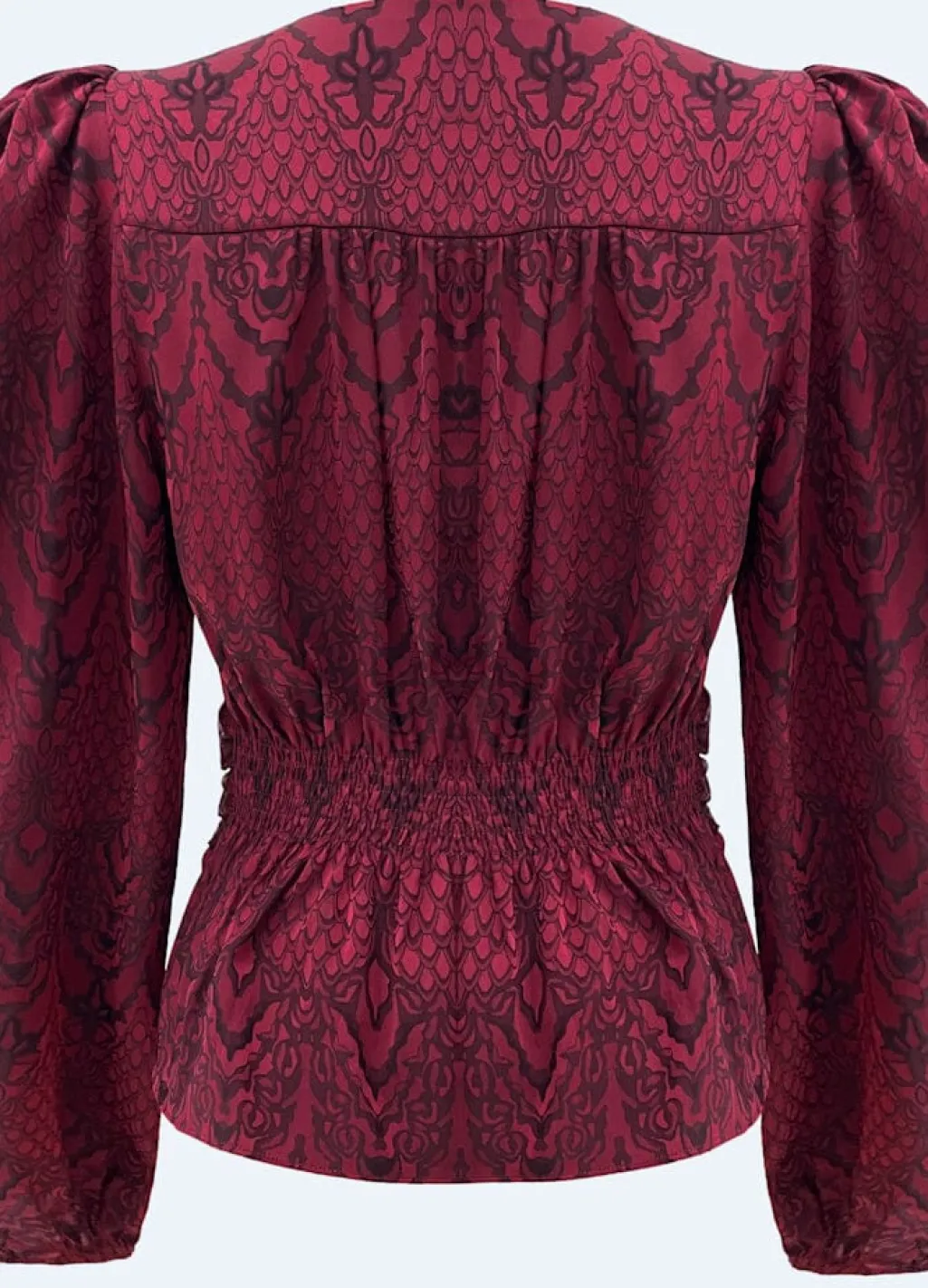 Bluse fra Liberte i dyb rød bordeauxfarve med animal print-mønster. Blusen har lange ærmer og en v-hals med en snoet detalje foran.