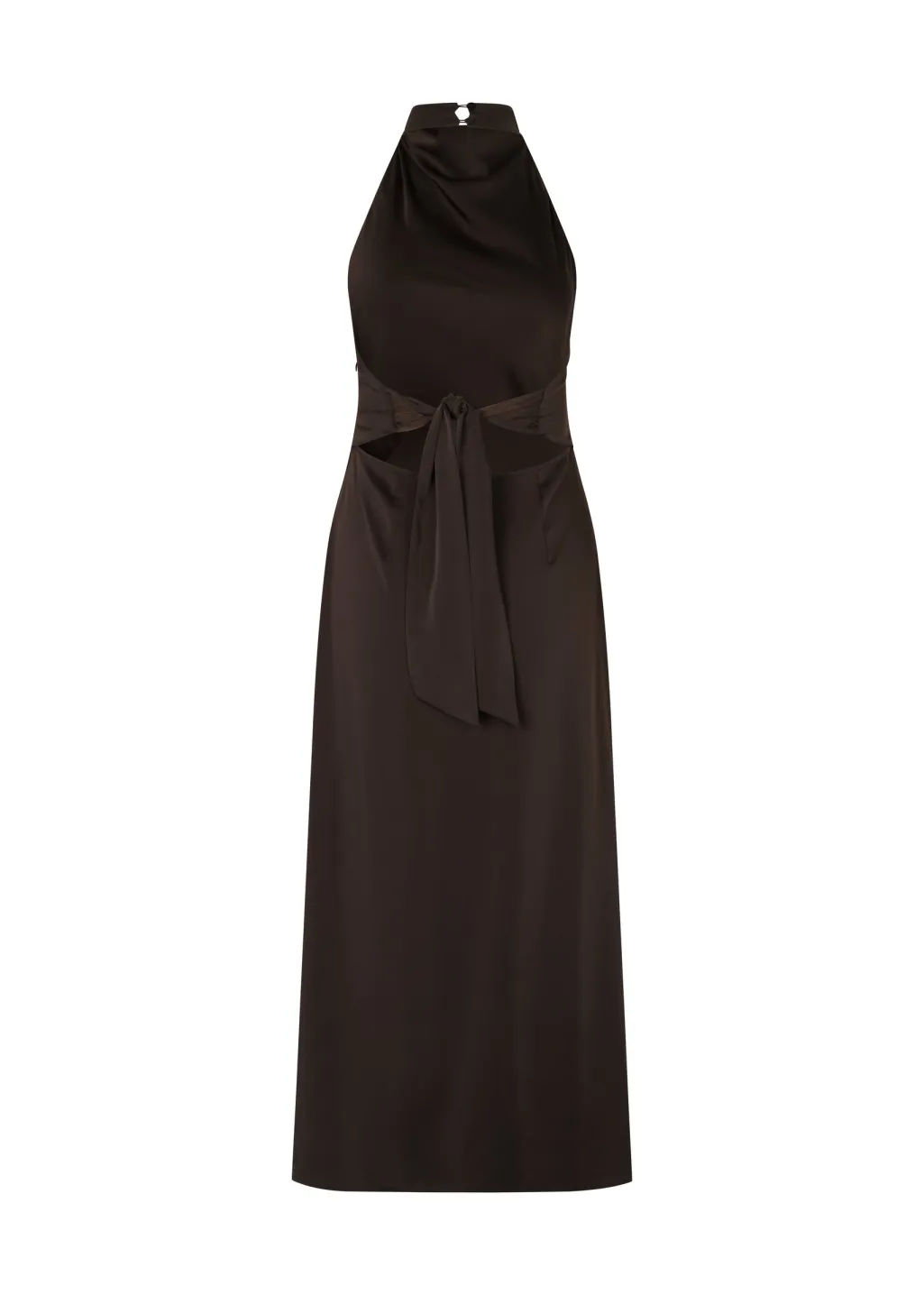 Brun kjole fra Modström, lavet af polyester med elastan. Kjolen passer til formelle begivenheder, bryllupper og festlige lejligheder.