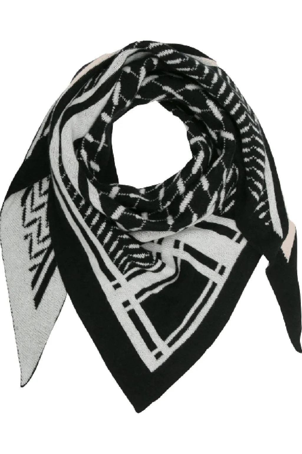 Trekantet tørklæde fra Lala Berlin i sort og hvid. Tørklædet har et geometrisk mønster og er fremstillet af blødt cashmere, der ikke kradser mod huden.