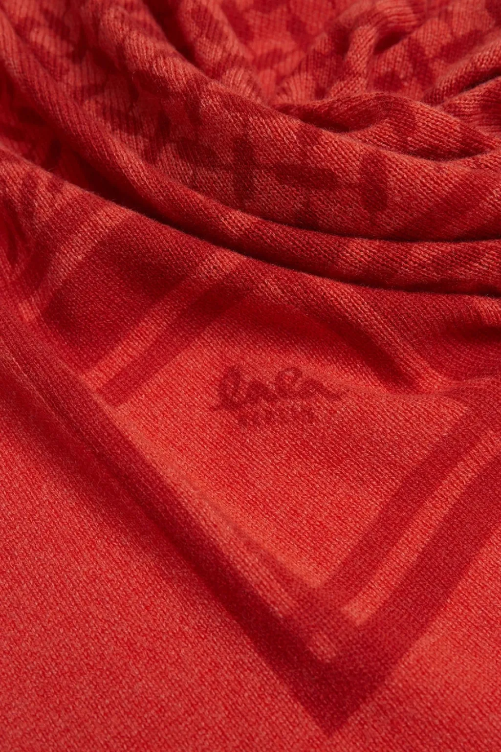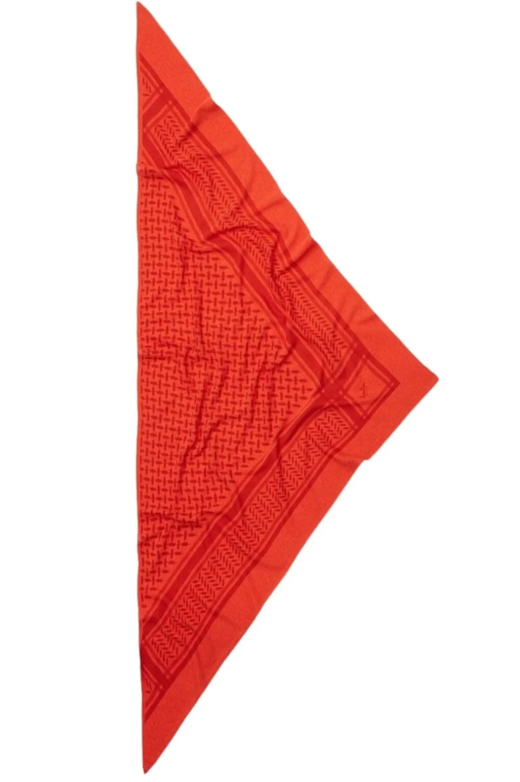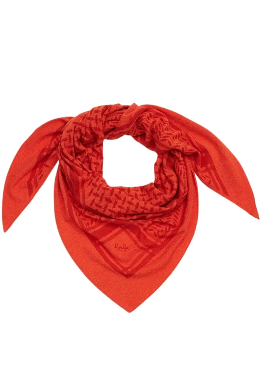 Trekantet tørklæde fra Lala Berlin i orange og rød. Dette tørklæde har et geometrisk printmønster og er fremstillet i blødt cashmere med brandets karakteristiske design.