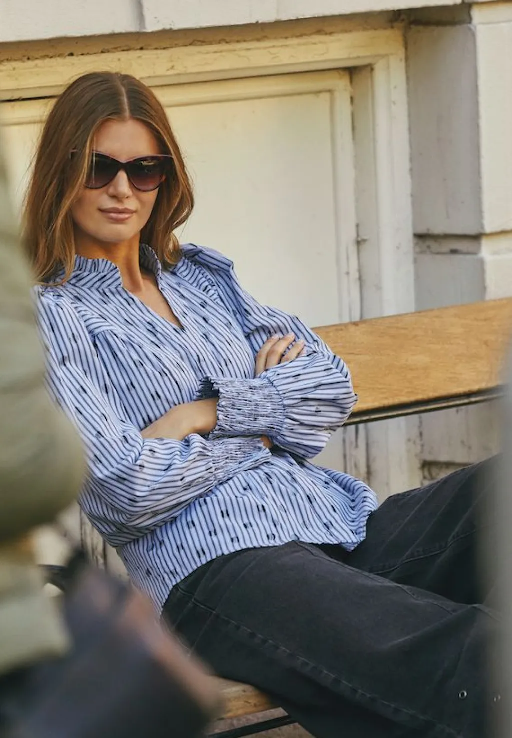Blå skjorte fra Co´Couture med striber og prikker. Skjorten har en rynket krave med flæser og lange ærmer med flæsedetaljer.