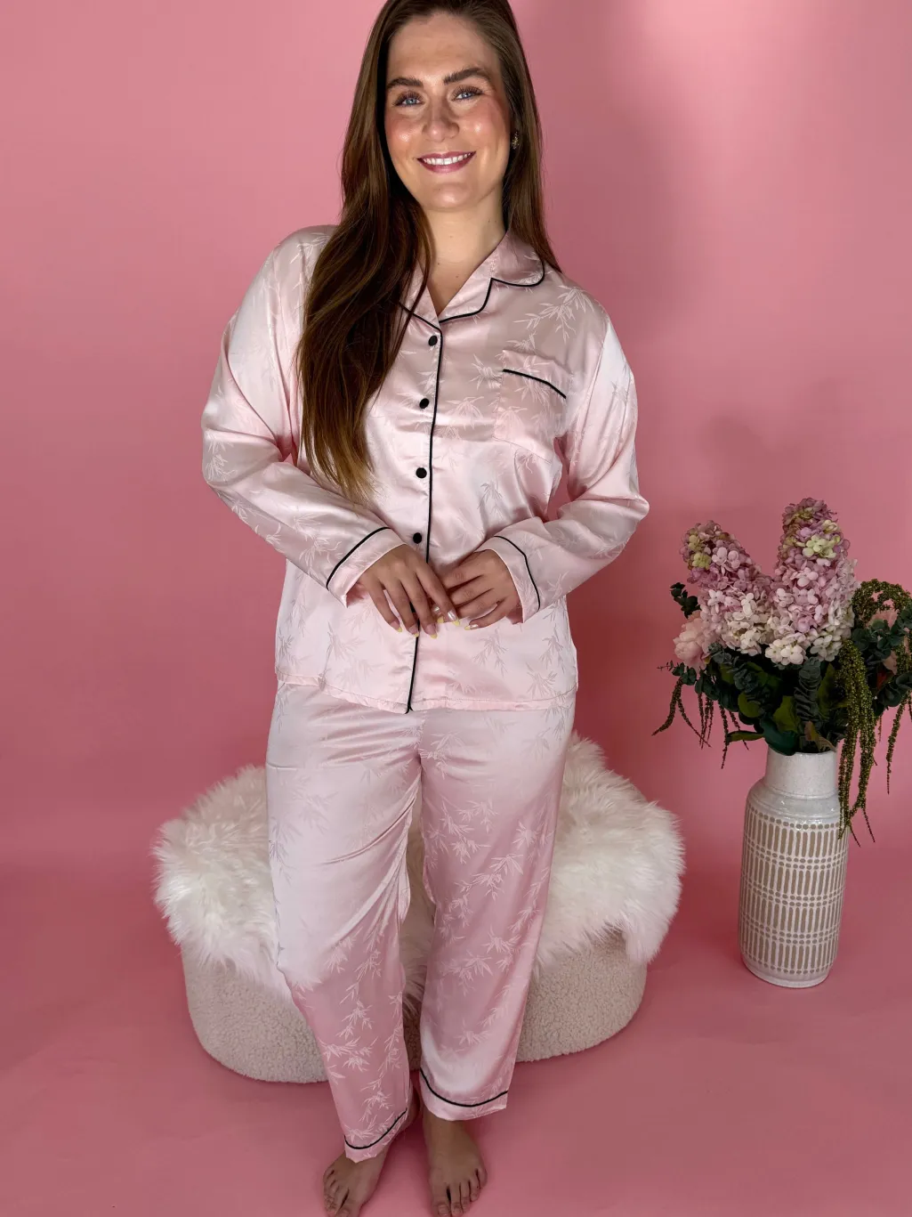 Lyserød pyjamas fra A-bee med sort kantebånd og bladmønster. Sættet består af en skjorte med knaplukning og matchende bukser. Bemærk: Falder lille i størrelsen.