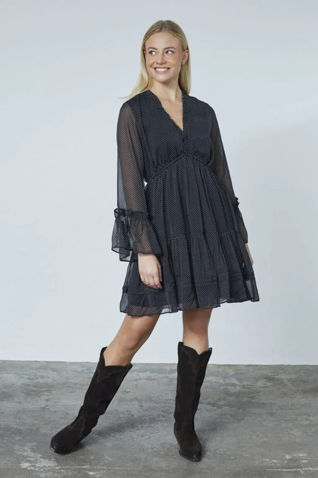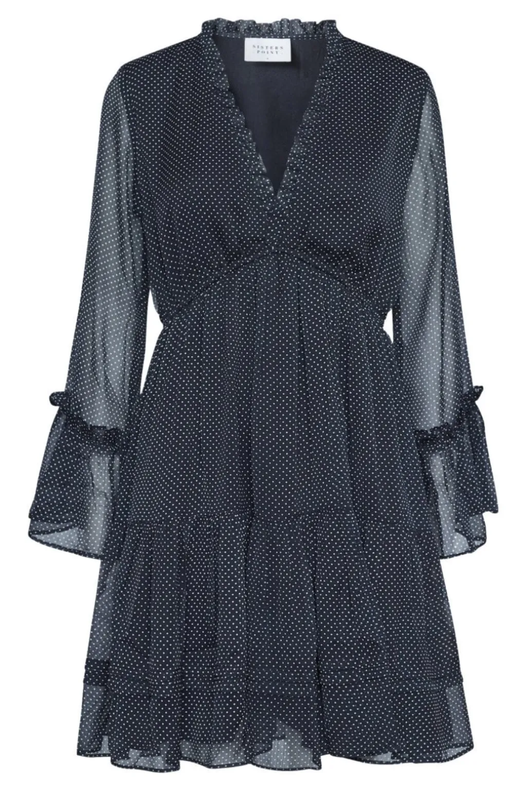 Sort kjole med hvide prikker fra Sisters Point. Kjolen har lange gennemsigtige ærmer med flæser og en V-udskæring.