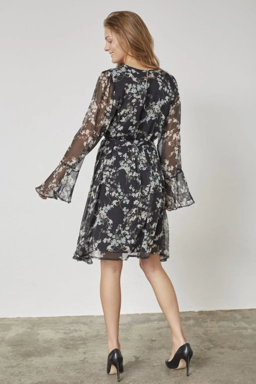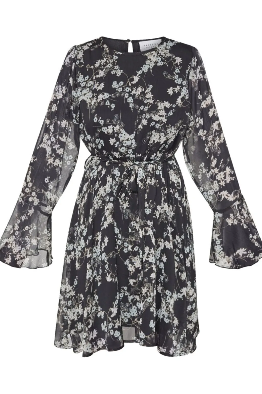 Sort kjole fra Sisters Point med blomsterprint i lyse farver. Kjolen er knælang med lange, transparente ærmer.
