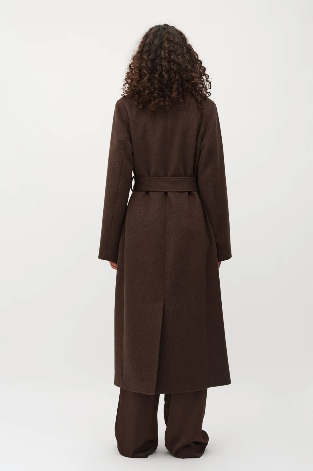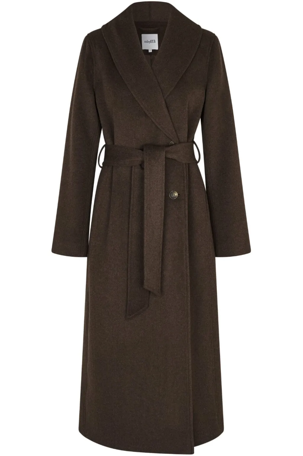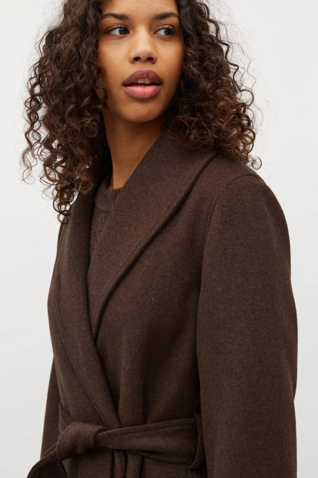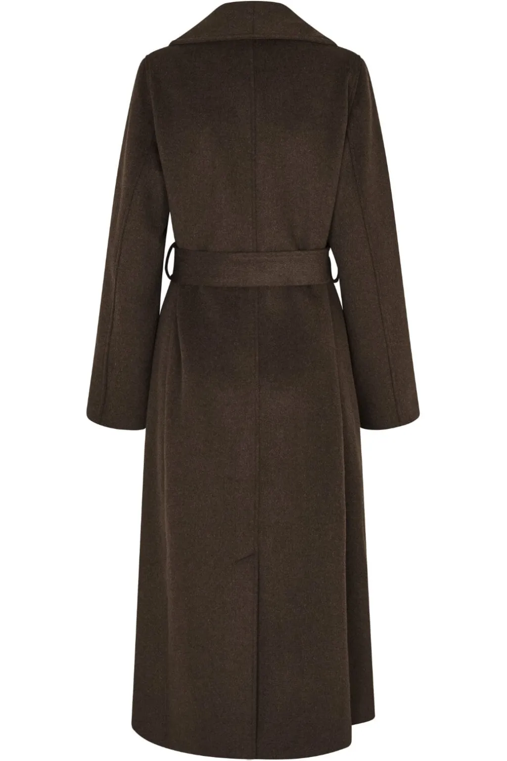 Lang frakke fra MbyM i brun. Frakken har et bindebælte i taljen og en bred krave. Den når under knæene.