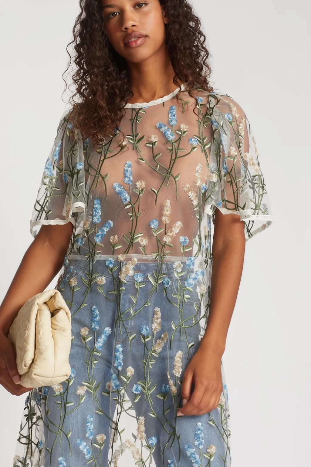 Lang kjole fra Munthe med gennemsigtigt stof og aftagelig underkjole. Kjolen har broderede blomster i blå og hvide nuancer med pailletter, der skaber et detaljeret mønster.