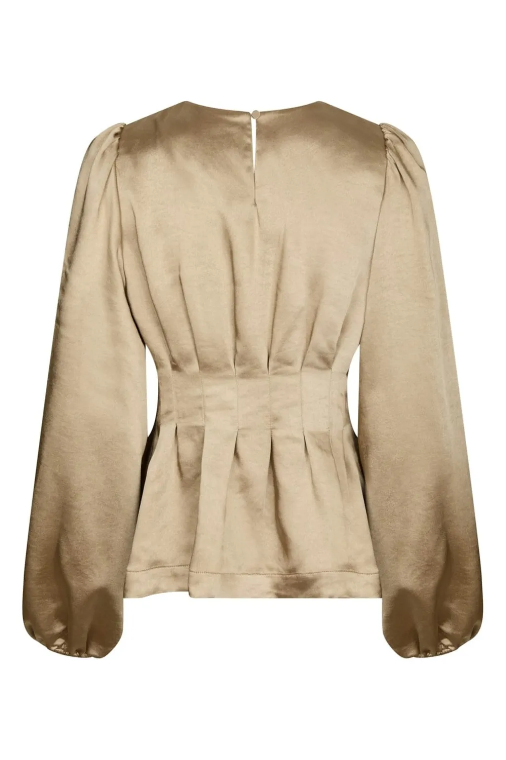 Gylden sateen-bluse fra Neo Noir med rund halsudskæring og lange ærmer. Blusen har puffede ærmer ved skuldrene og strukturerede sømme med folder foran og bagpå.