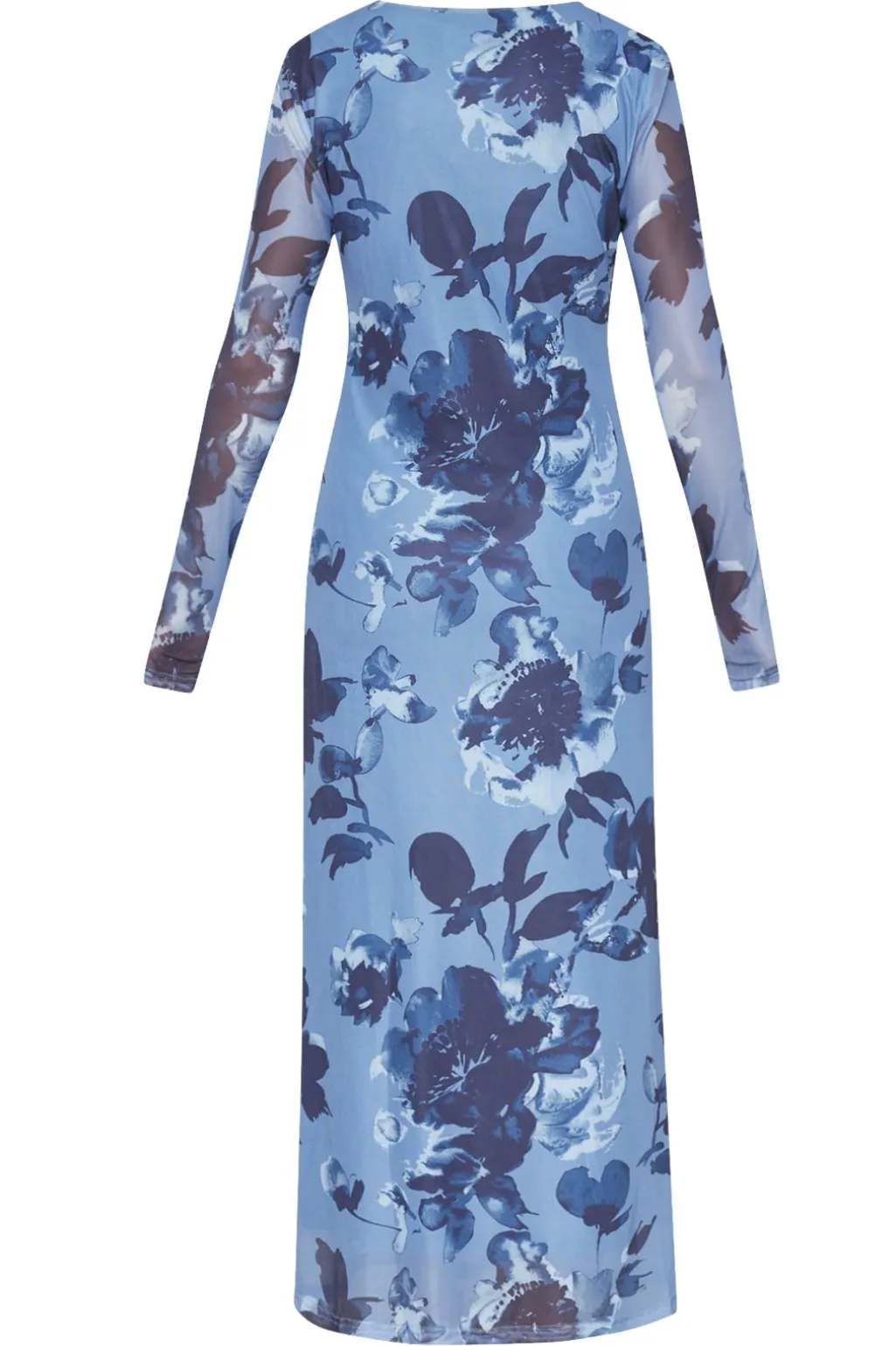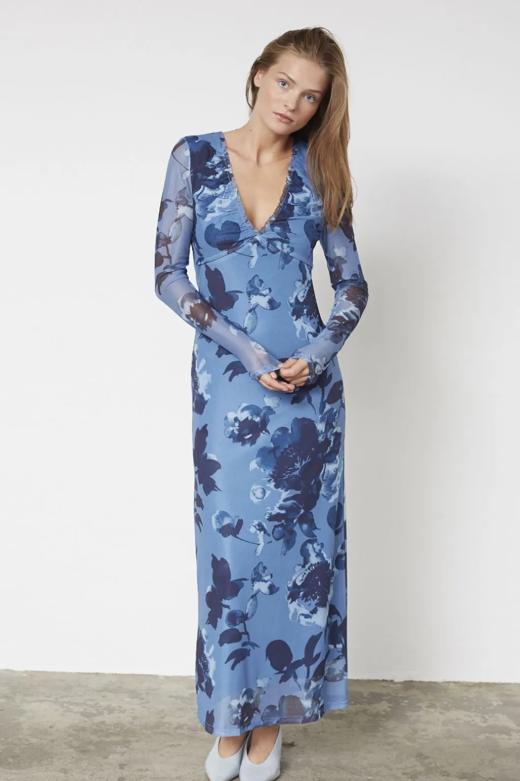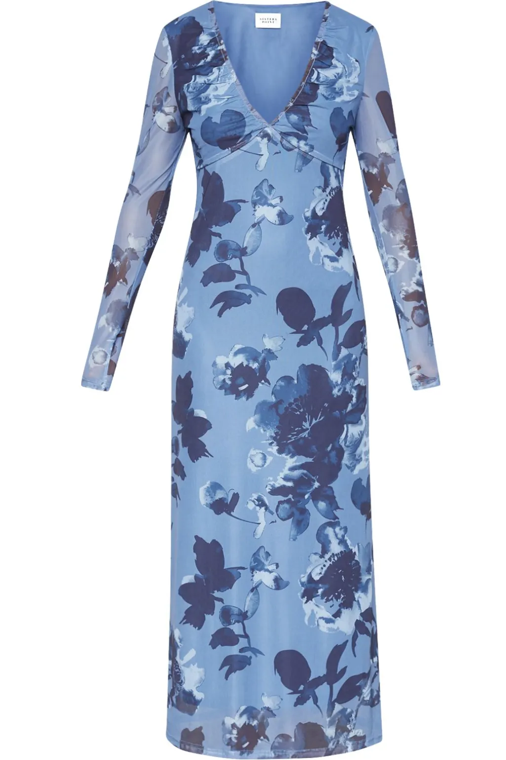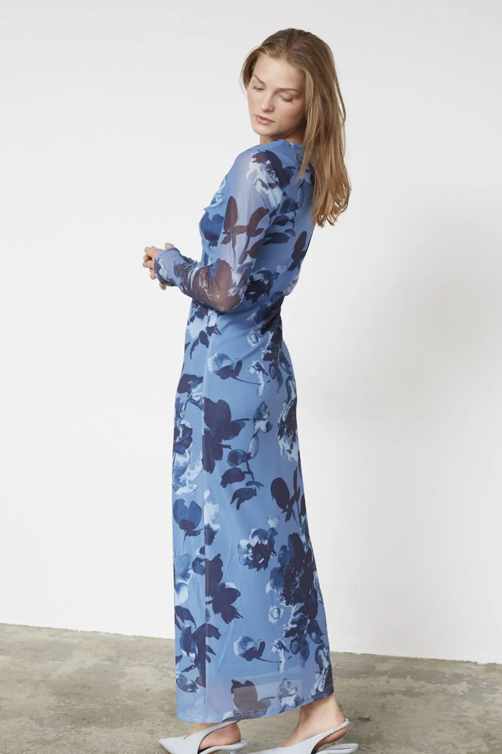 Lang kjole fra Sisters Point i blå nuancer med blomstret print. Kjolen har lange, tætsiddende ærmer og en V-udskæring.