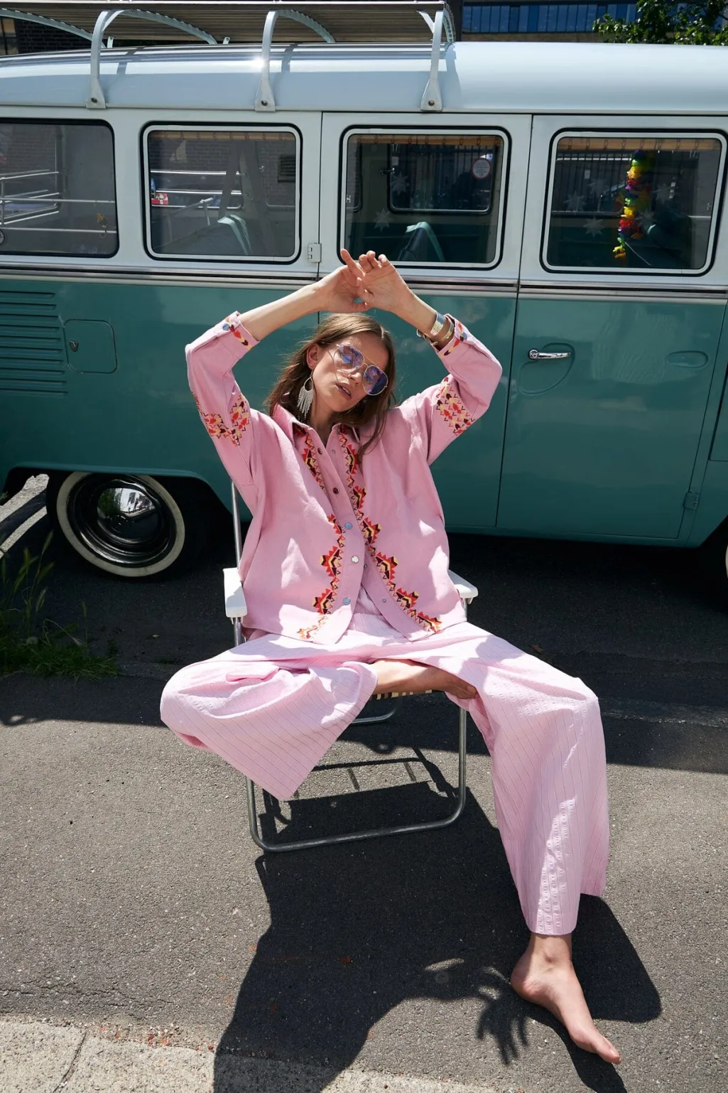Lyserød overskjorte fra Lollys Laundry med broderede mønstre. Skjorten har skjortekrave, trykknapper og en løs pasform.