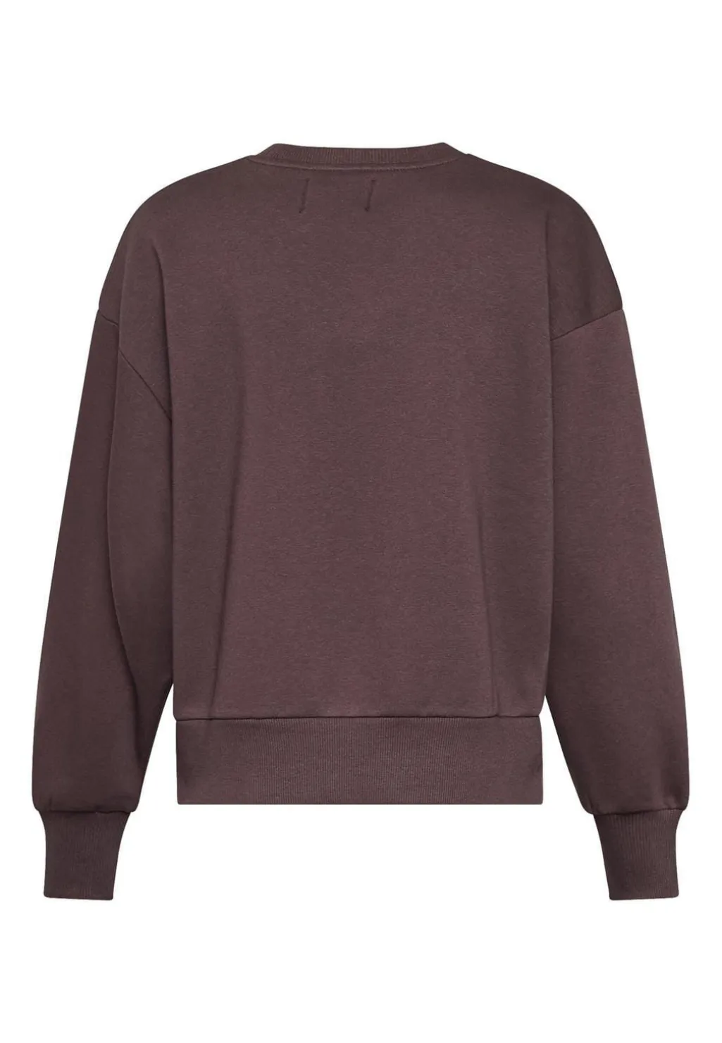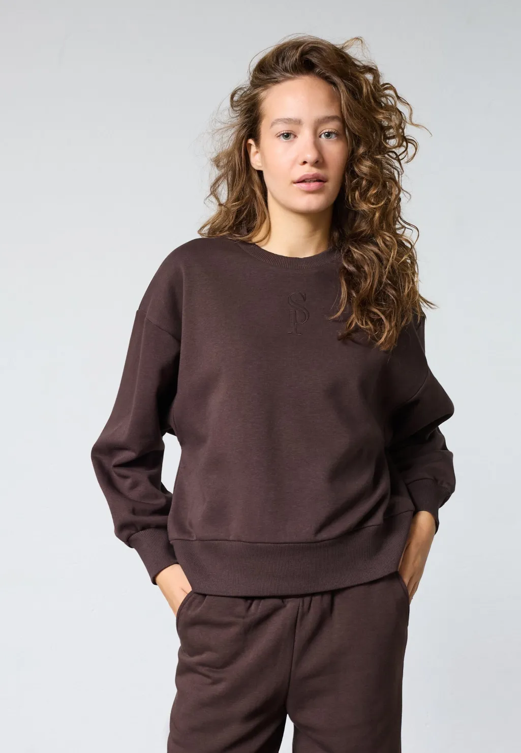 Brun sweatshirt fra Sisters Point med rund halsudskæring og lange ærmer. Den har en overdimensioneret pasform og et broderet SP-logo på brystet.