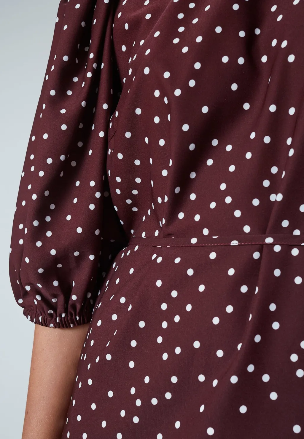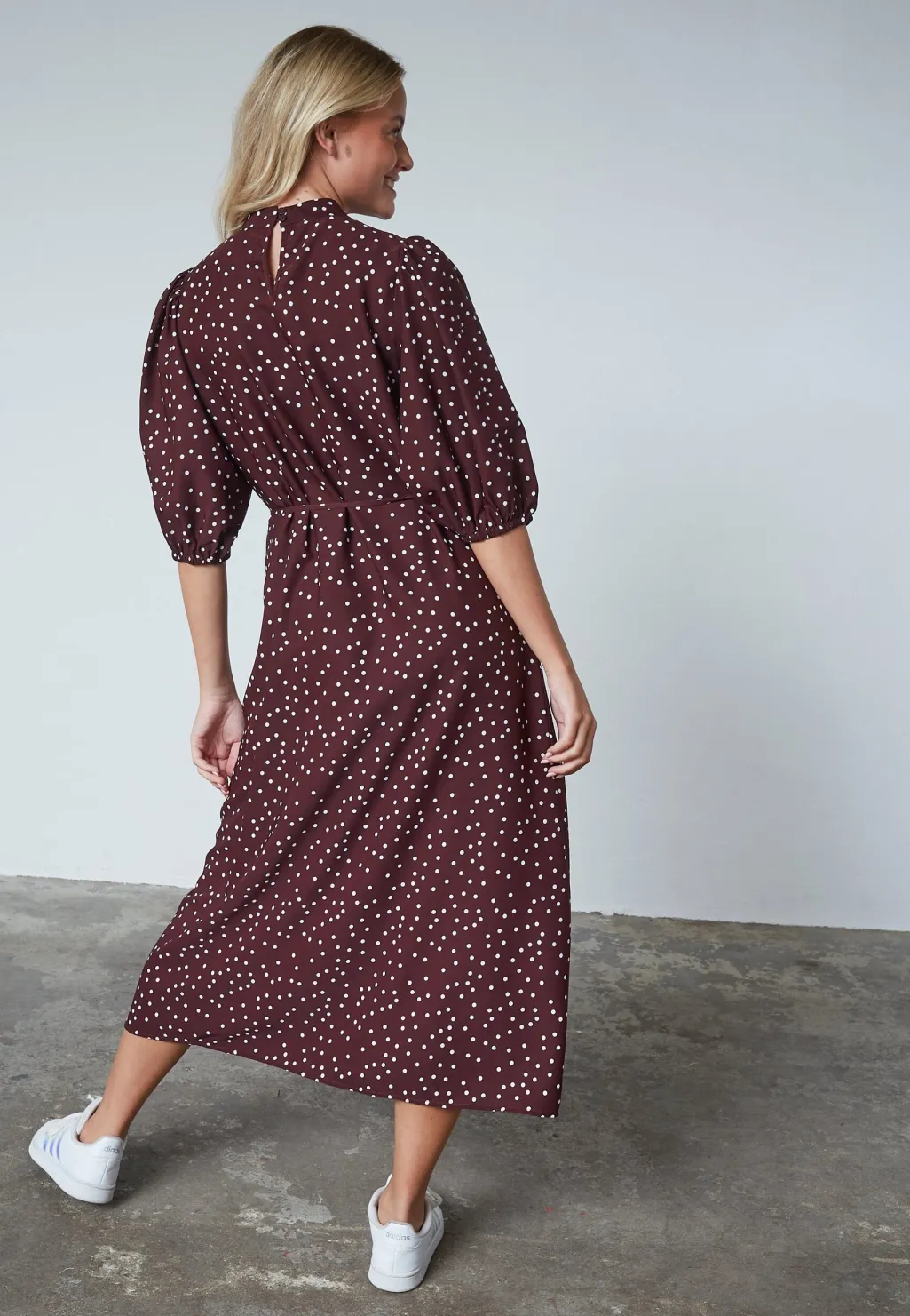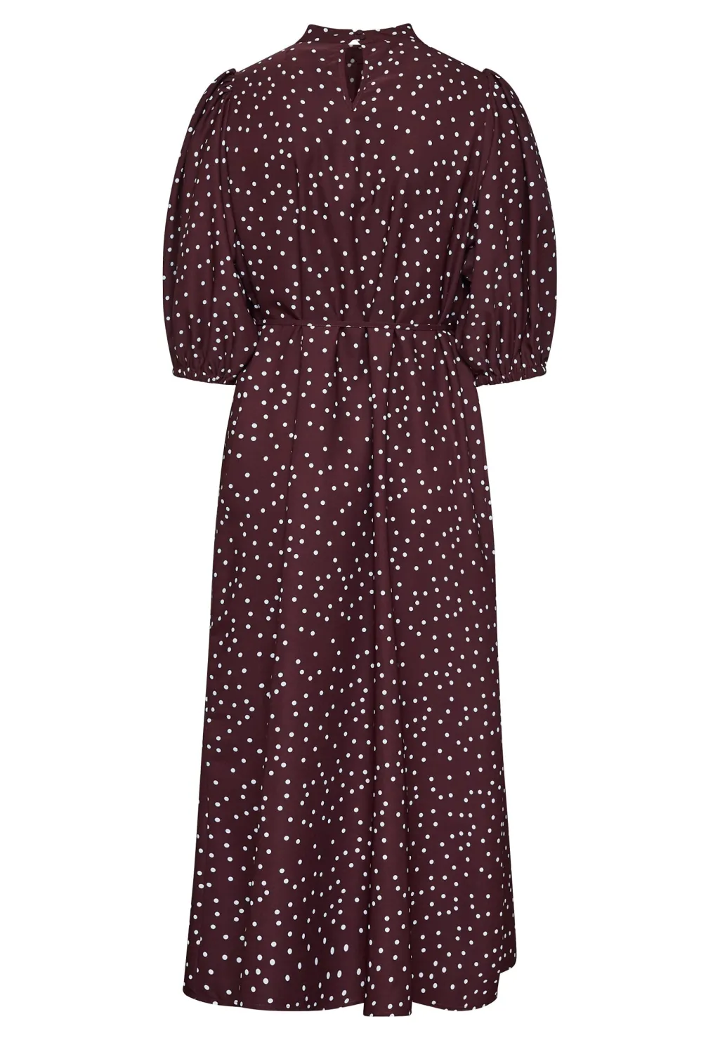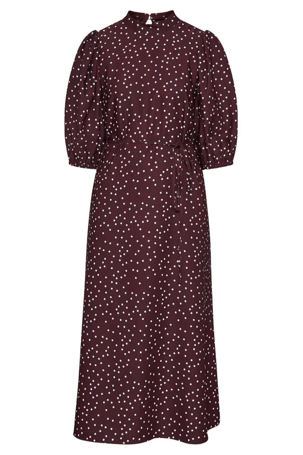 En bordeauxkjole fra Sisters Point med hvide prikker. Kjolen har en højhalset udskæring og bindebåndsdetaljer, der giver mulighed for justering.