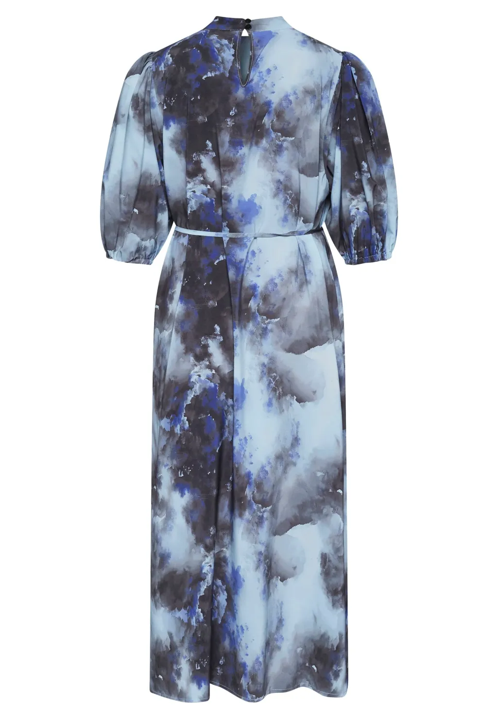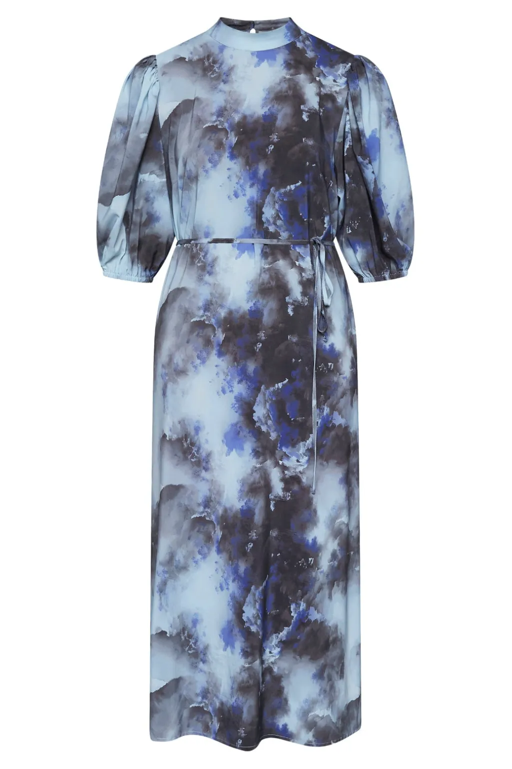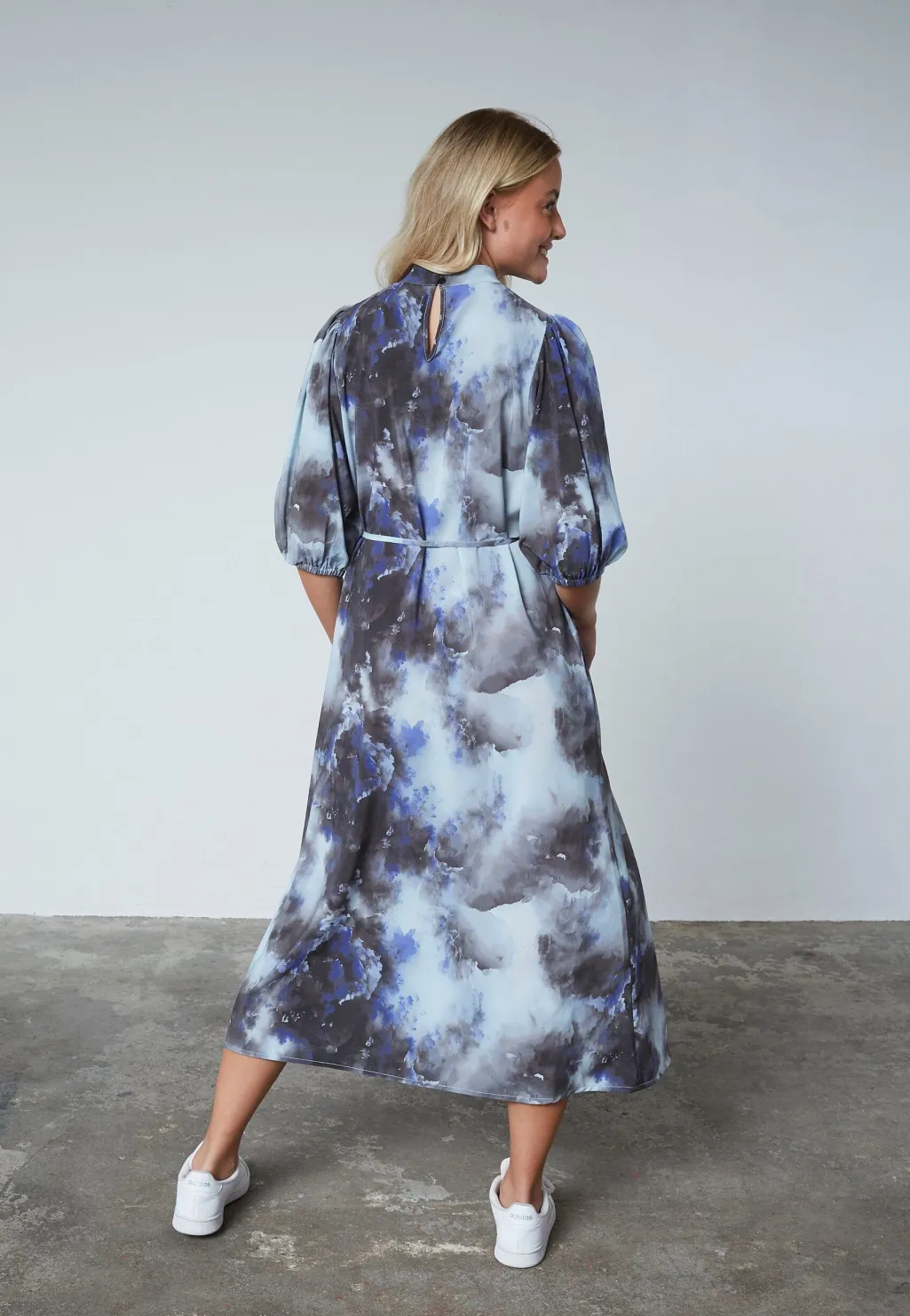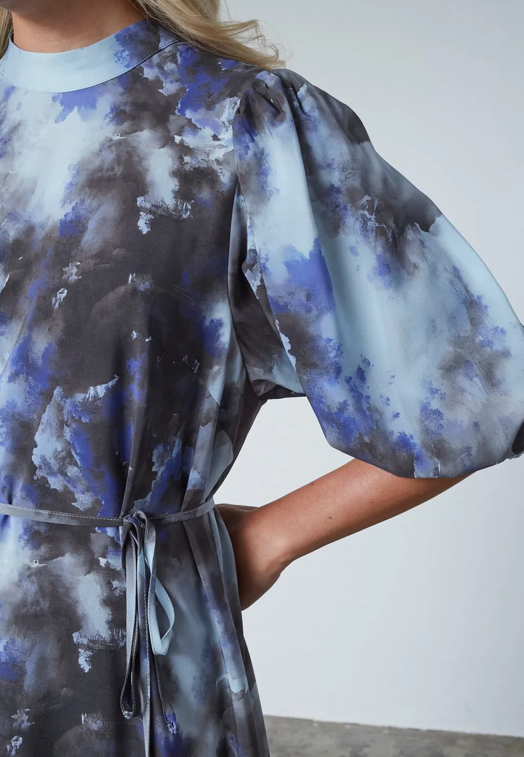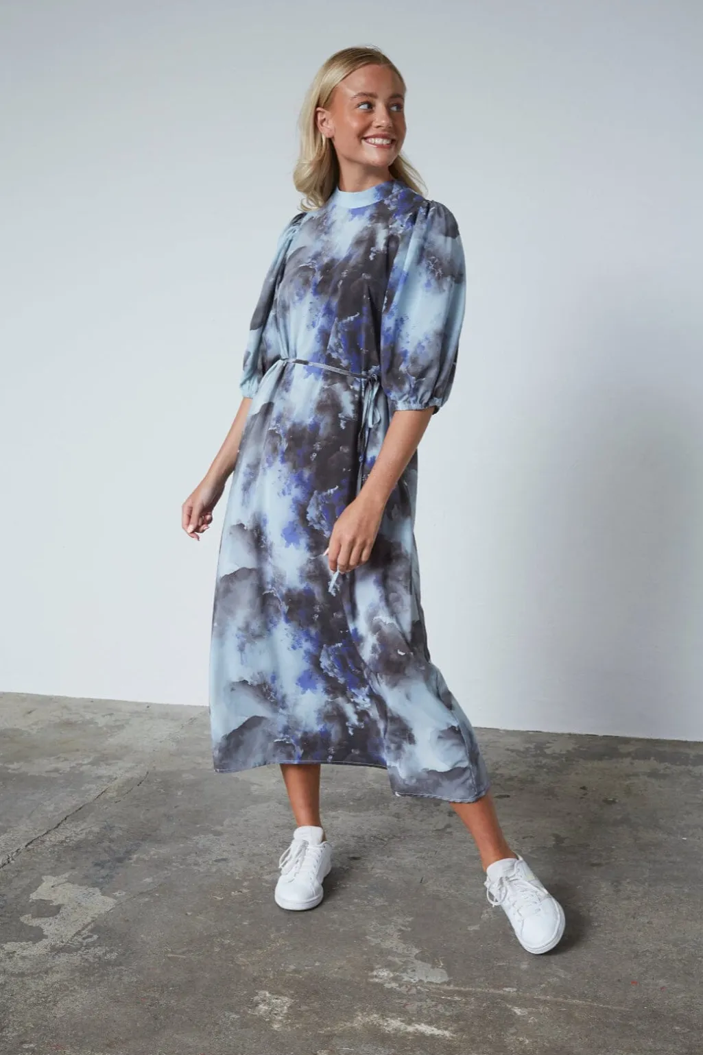 Kjole fra Sisters Point med abstrakt mønster i grå og blå nuancer. Kjolen har en høj hals, trekvartærmer og et smalt bælte i taljen.