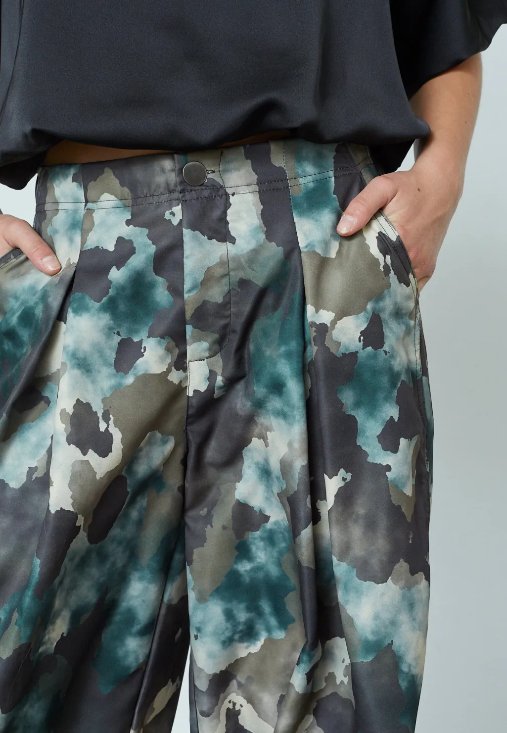 Bukser fra Sisters Point i 100 % polyester med et abstrakt camouflage-mønster i grønne og blå nuancer. Bukserne har en løs pasform og høj talje.