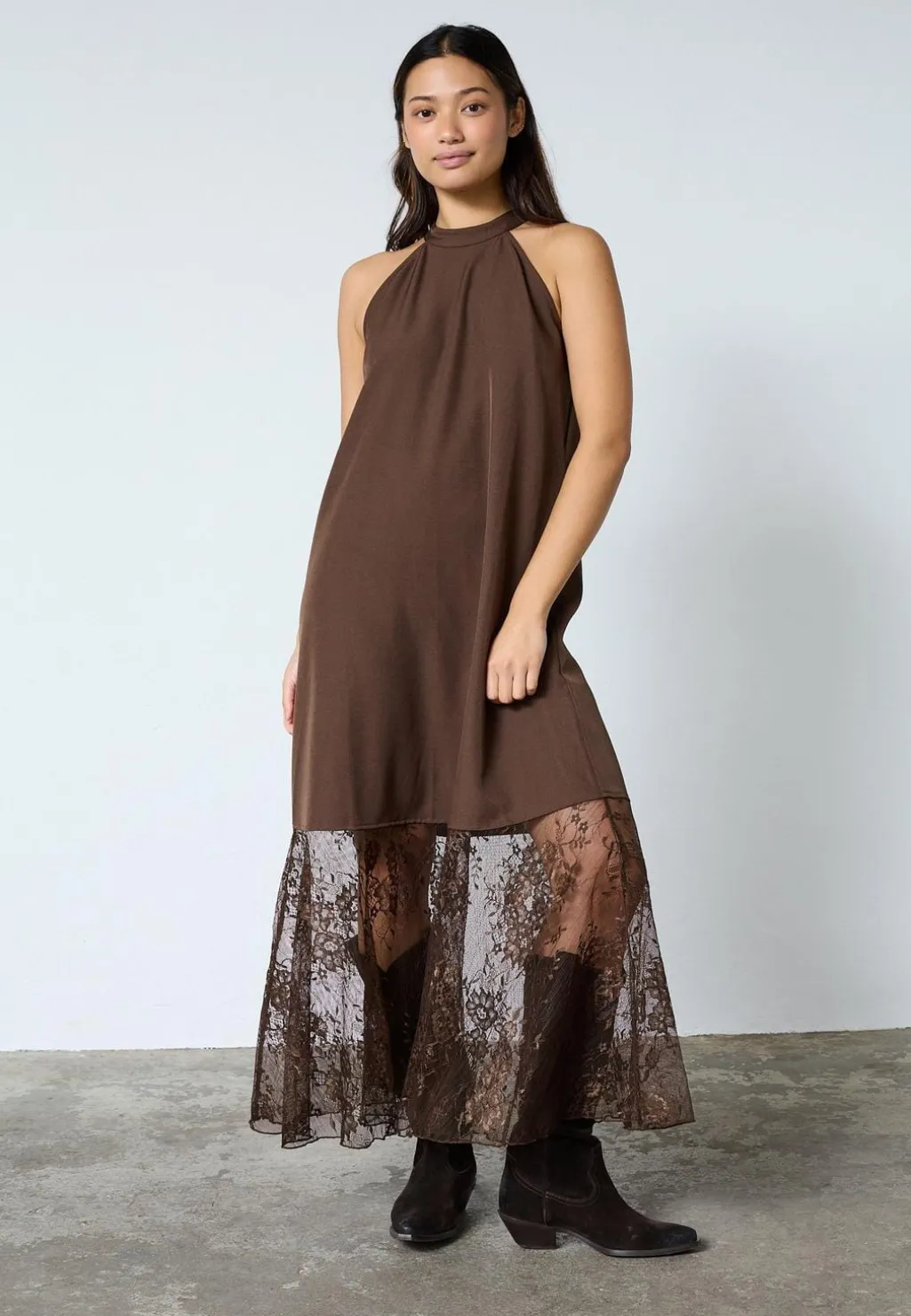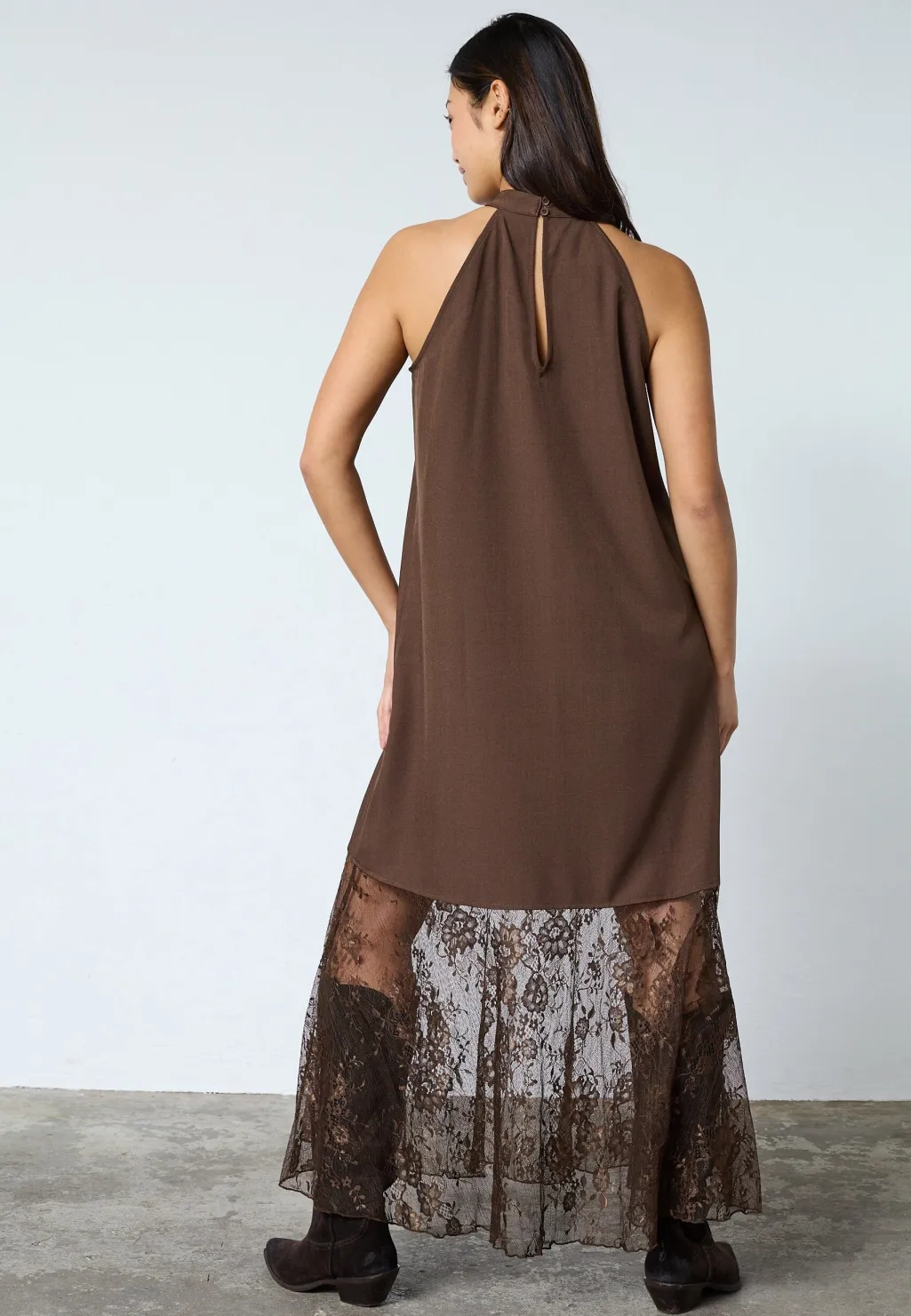 Brun kjole fra Sisters Point. Kjolen er ærmeløs med høj hals og går ned til anklerne. Nederste del har gennemsigtig blonde i et blomstermønster.
