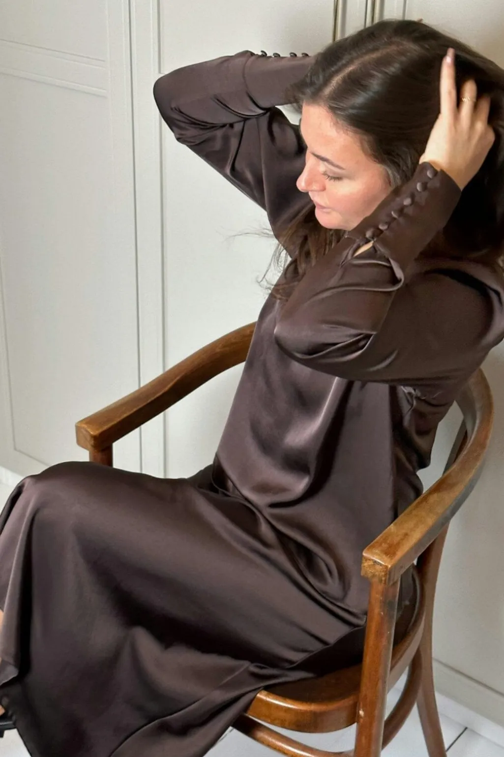 Mørkebrun nederdel fra Neo Noir i heavy sateen. Nederdelen har en normal pasform og går til midt på læggen. Stoffet har en glat, skinnende overflade.