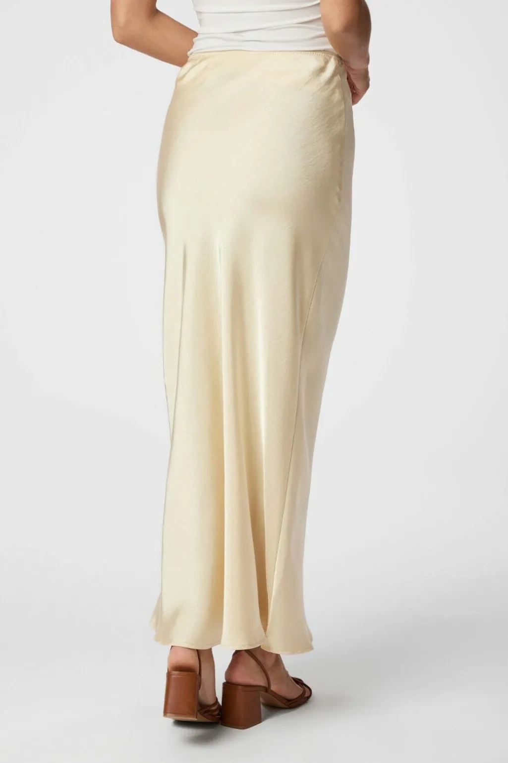 Satin-nederdel fra Neo Noir i lys gul. Nederdelen har en høj talje med elastik og et A-formet design med skrå skæring, der giver en fin silhuet.