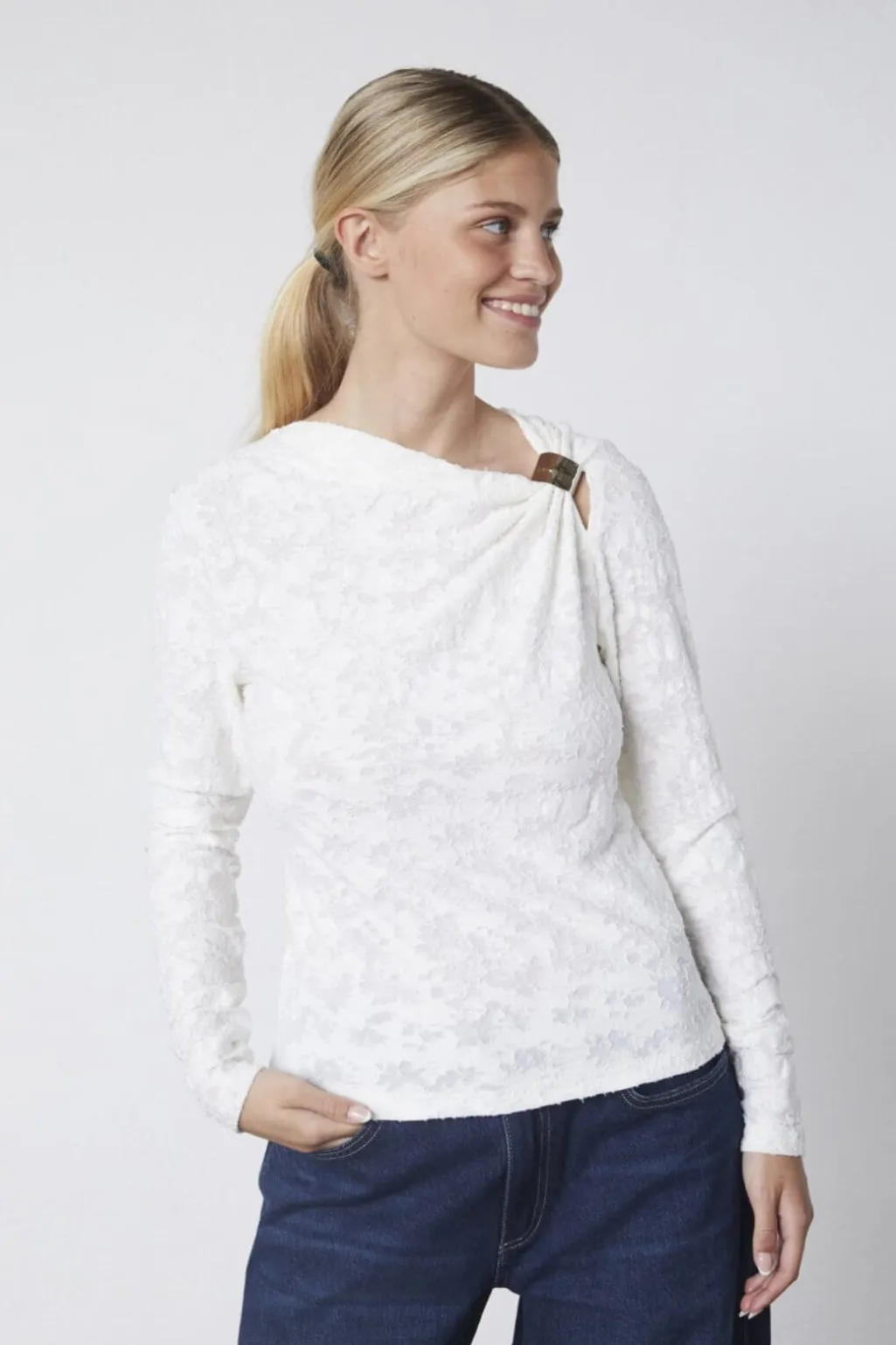 Cremehvid bluse fra Sisters Point med et floralt burnout-mønster. Blusen har lange ærmer og en slim fit-pasform. Et dekorativt metalspænde pryder den runde hals.