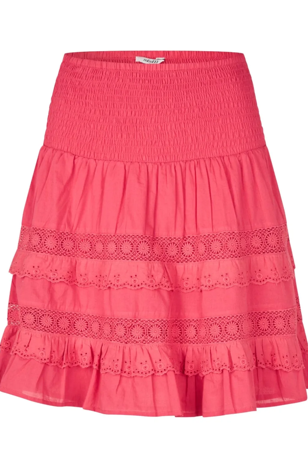 Rød nederdel fra MbyM med smocket talje. Nederdelen har flere lag med blondedetaljer og flæser, der giver et let og luftigt udtryk.