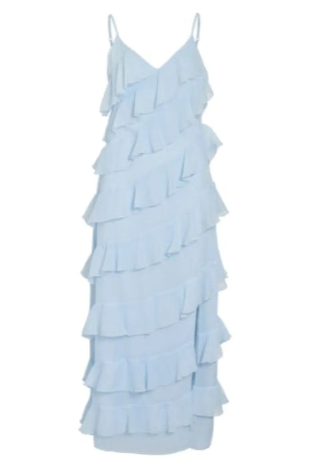 Ankellang kjole fra Vila i en lys blå nuance. Kjolen har en V-udskæring og er uden ærmer. Den kommer med en regular pasform, der hverken sidder løst eller tæt.
