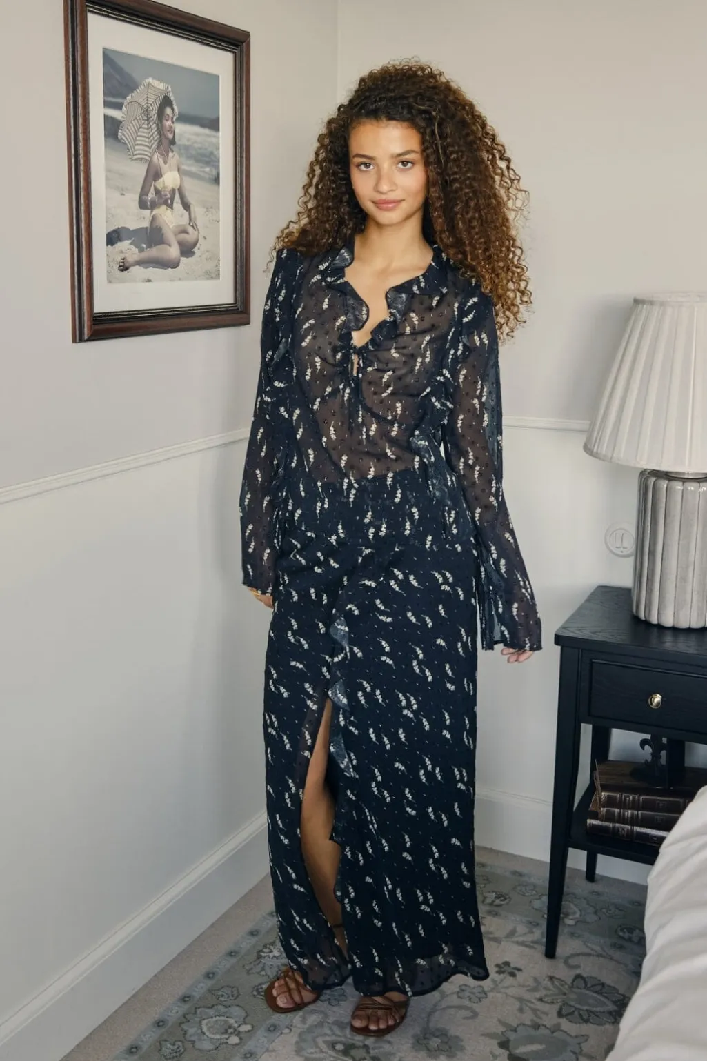 Sort nederdel fra Neo Noir med blomsterprint på hele fladen. Den har en slids i siden og flæsedetaljer foran, som giver et blødt fald i stoffet.