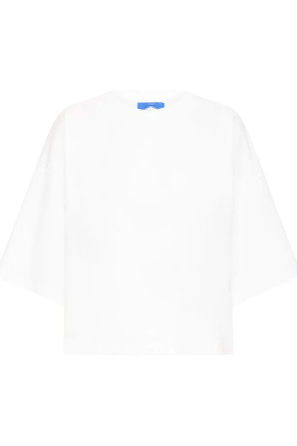 Hvid cropped t-shirt fra Ball med løs pasform. T-shirten har en rund halsudskæring og korte ærmer. Der er et Ball-logo på ærmet og branding på ryggen.