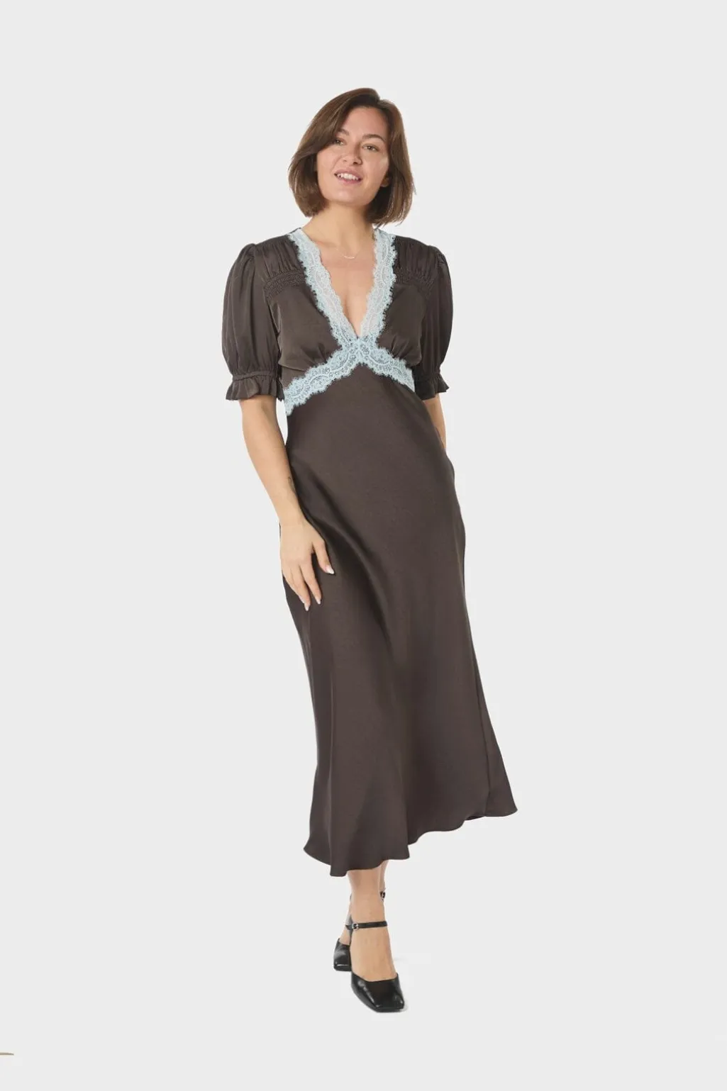 En lang kjole fra Neo Noir, lavet af 97 % bomuld og 3 % elastan i en mørkebrun nuance.