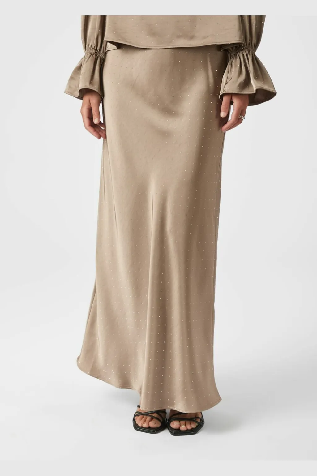 Lang nederdel fra Neo Noir i brun-grå satin med små pailletter fordelt i et prikkemønster over hele nederdelen.